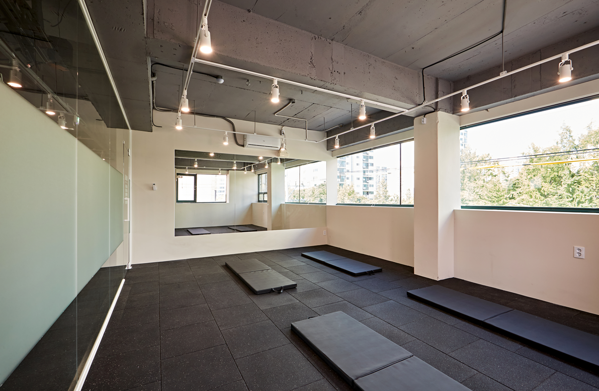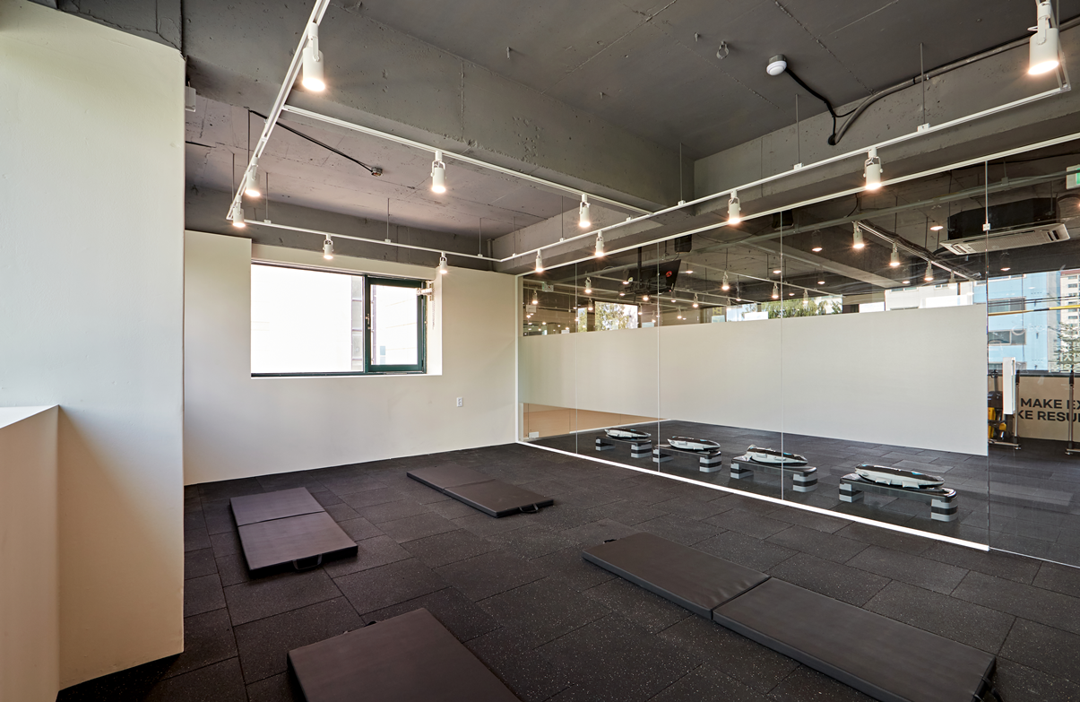 헬스장 내 요가 및 스트레칭 공간은 완전히 다른 무드로 연출했습니다.