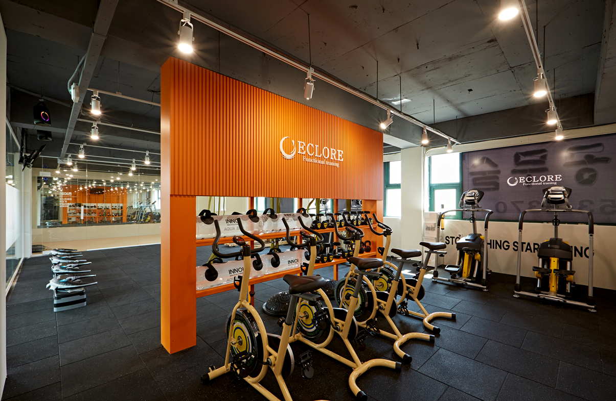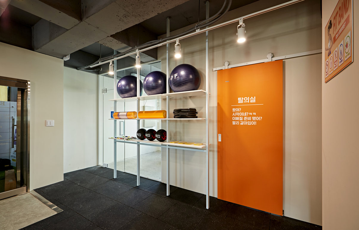 완공된 오렌지색 가벽은 헬스장 내부에서 가장 먼저 시선을 사로잡습니다.