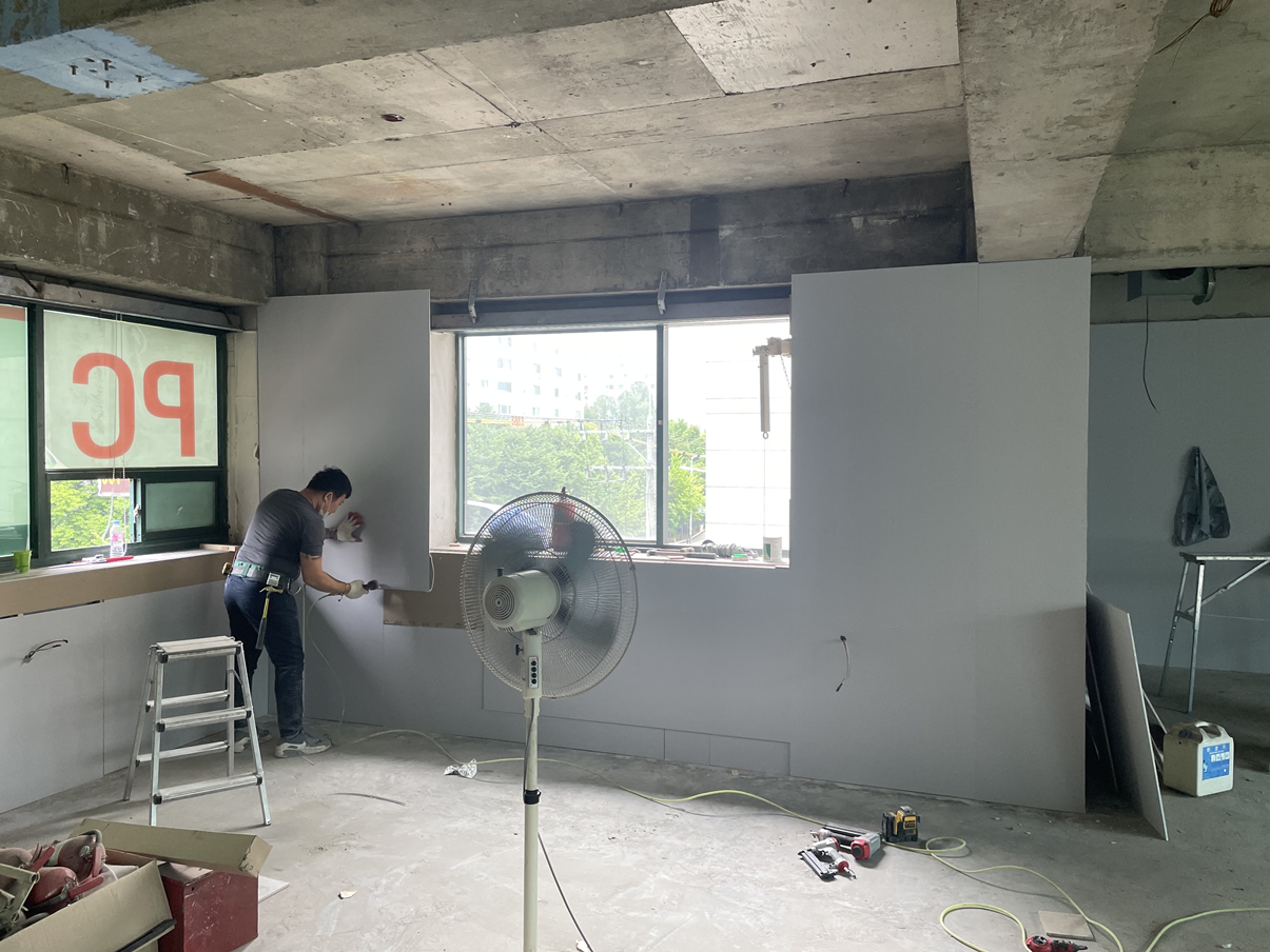 헬스장 인테리어에서 목공 공정도 빠질 수 없는 작업입니다.