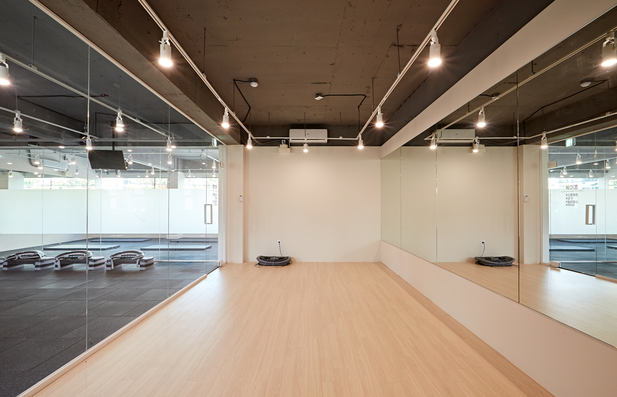 또한 벽면에는 전면 거울 시공을 통해 공간을 확장감 있게 보이도록 하고,