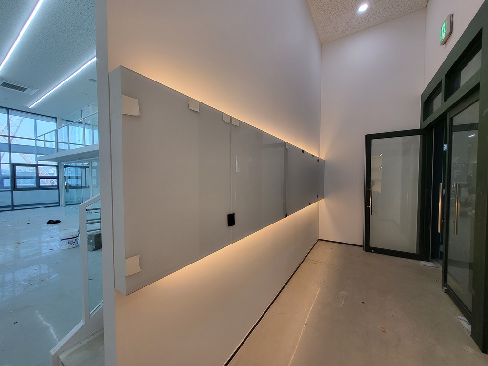 사무실 내부로 들어가면 가장 먼저 가벽이 눈에 들어오는데요. 화이트 인테리어로 전체를 통일했기 때문에 밋밋하지 않게 간접등도 설치했고, 추가로 로고 사인물을 설치해 포인트를 줄 예정입니다. 간접등의 은은한 조명으로 입구부터 밝고 세련된 이미지가 연출 되었습니다.