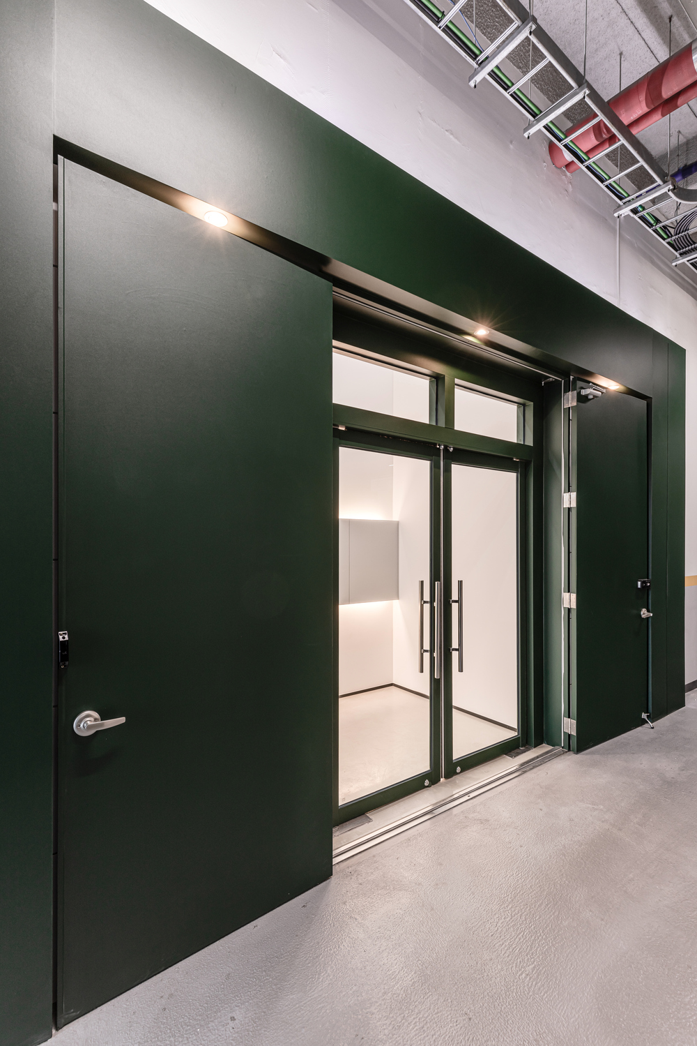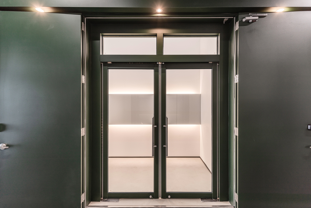 먼저 입구 파사드입니다. 입구 파사드는 깔끔하게 딥그린 컬러로 도장했고, 도어 사이드에 간접등을 추가 했습니다. 그리고 출입문은 편리하게 양문형 도어로 사용했고, 시트 작업 없이 개방감 있게 마무리 했습니다.