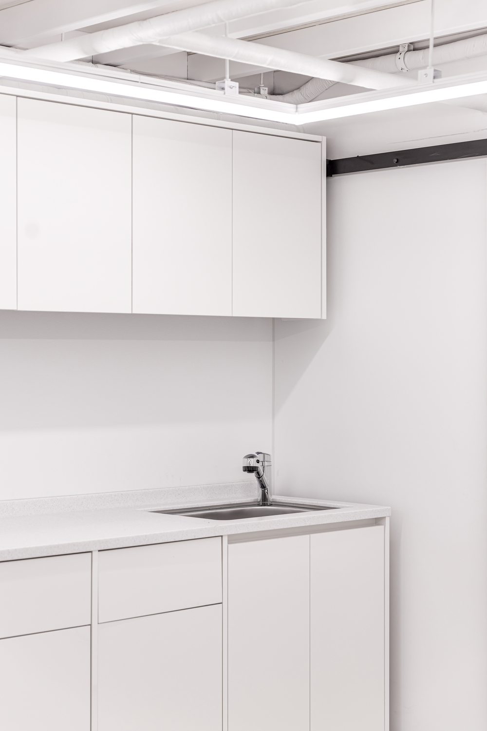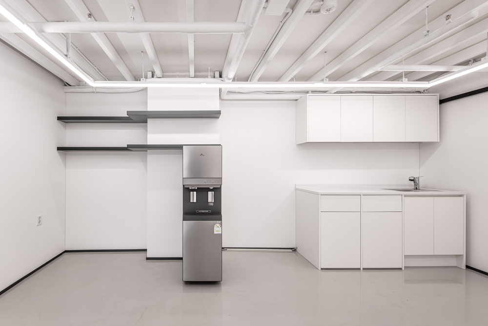 그리고 탕비실에는 코너 부분에 그레이 컬러의 벽선반을 설치 했습니다. 또한, 탕비실에는 추가로 테이블을 넣어 실용성을