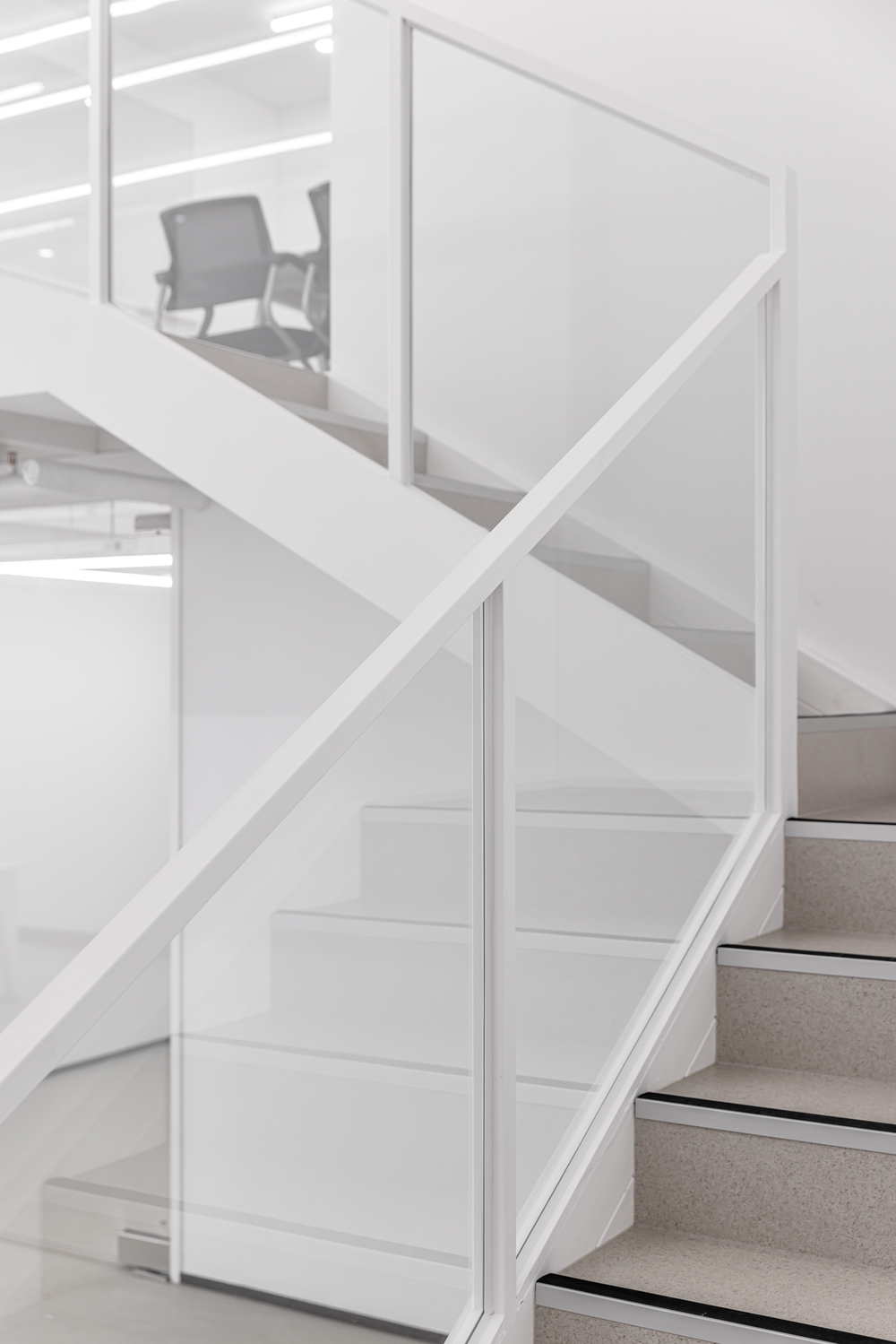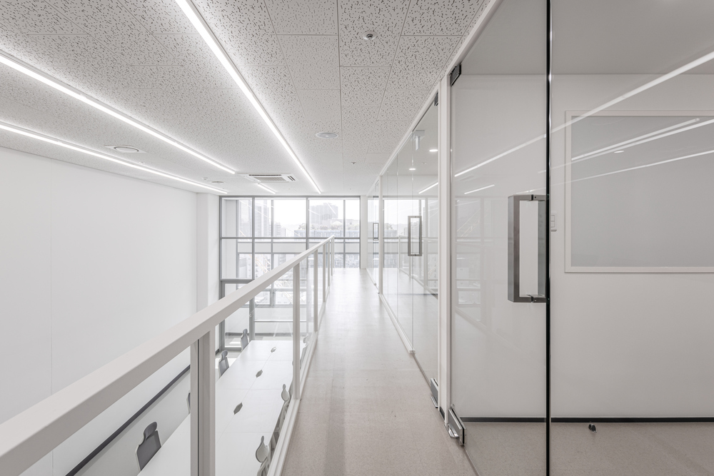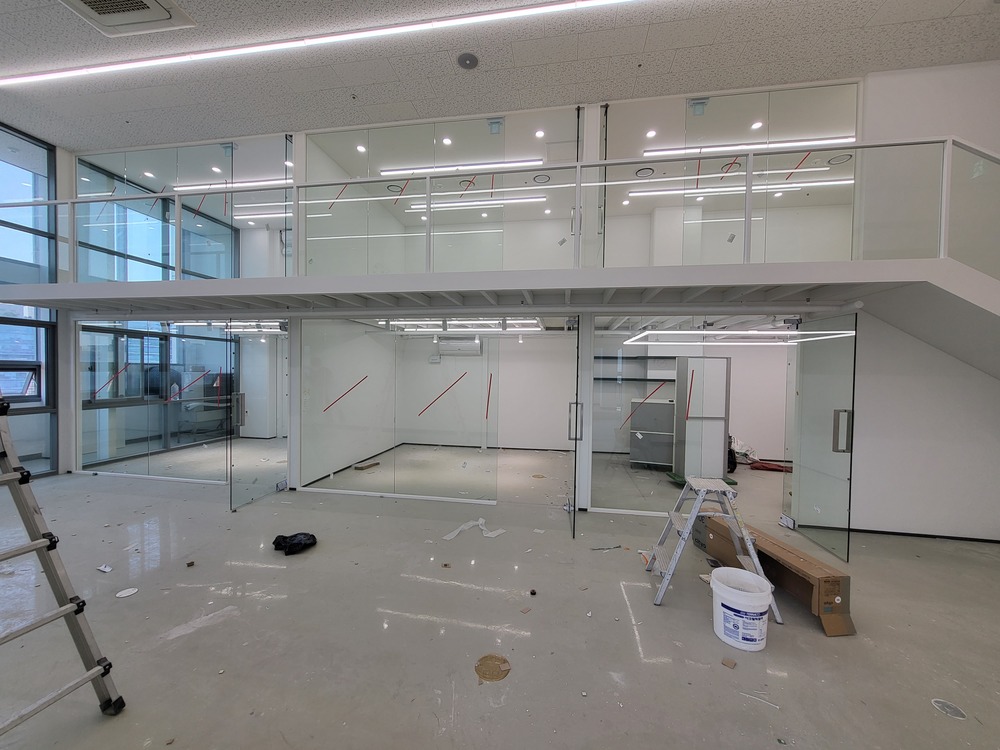 이번 경기 과천 상상 자이타워 사무실 인테리어는 복층 복도 구간의 안전바에 글라스월을 추가로 설치했습니다. 글라스월을 사용하여 답답함은 없고 탁 트인 개방감으로 심미적인 효과도 주었습니다.