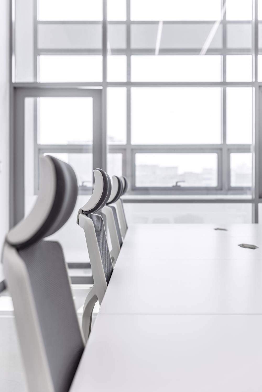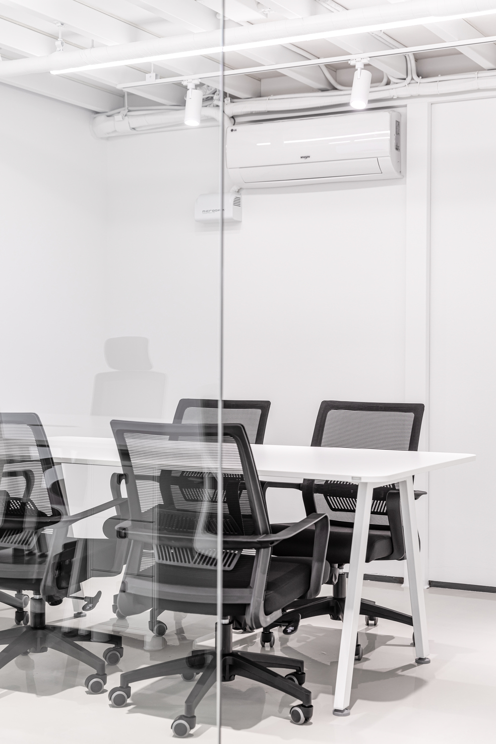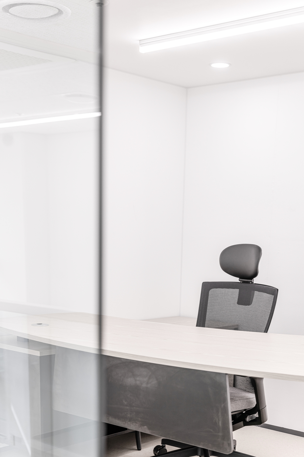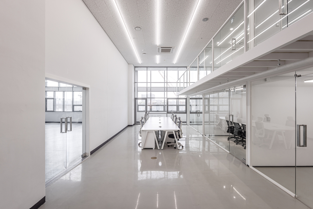 다음으로 소개해드릴 공간은 1층 회의실입니다. 회의실은 이동 동선을 고려해 메인 사무공간 맞은편으로 위치 시켰습니다.인테리어를 살펴보면 입구면을 글라스월로 설치했고 천장은 노출형 천장으로 시공해 탁 트인 개방감을 주었습니다.그리고 내부는 다른 공간과 마찬가지로 화이트 인테리어를 적용해 통일하면서 정석을 보여주었죠
