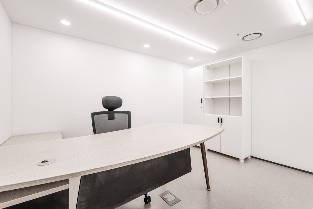 대표실에는 벽면 수납장을 배치하여 효율성을 높여주었습니다. 수납장은 대표실 평수를 고려해 916디자인 현장 시공팀에서 맞춤 제작해 딱 맞게 배치 되었는데요. 그래서 군더더기 없는 라인을 만들어낼 수 있었습니다