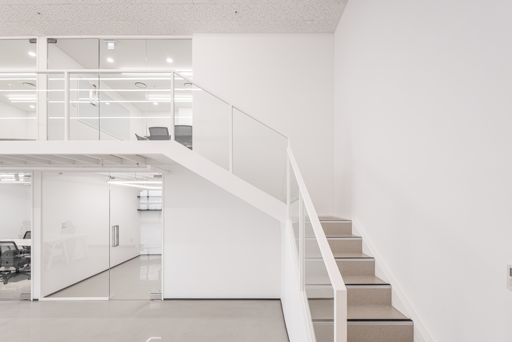 복층 공간도 동일하게 화이트 인테리어로 적용 했는데요. 1층 보다는 활용 가능한 평수는 적지만 사무실로 사용하기에는 충분한 공간이며, 글러스월로 개방감이 더 크게 느껴지도록 만들었습니다.
