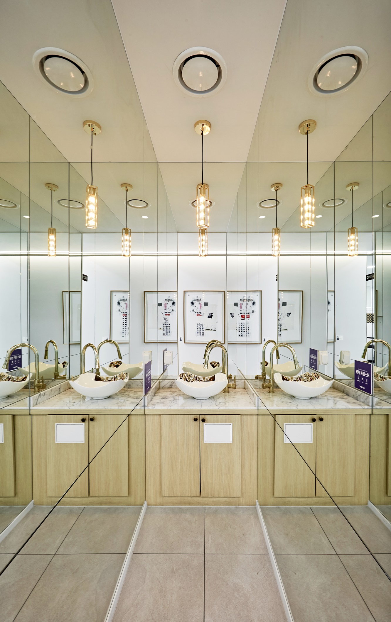 세면대는 고급스러운 골드 색상을 사용하고 고급 대리석으로 마감하였습니다.