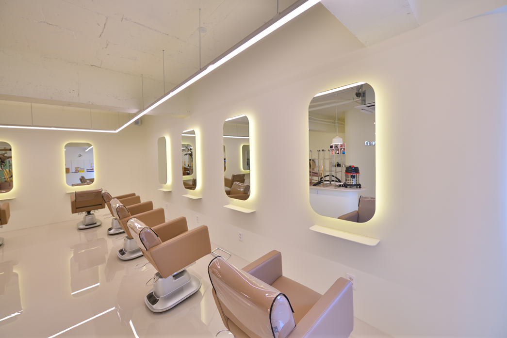 미용실의 핵심 공간인 시술존은 각 좌석마다 개별 경대를 배치하여 고객 프라이버시와 편안함을 높여주었습니다.