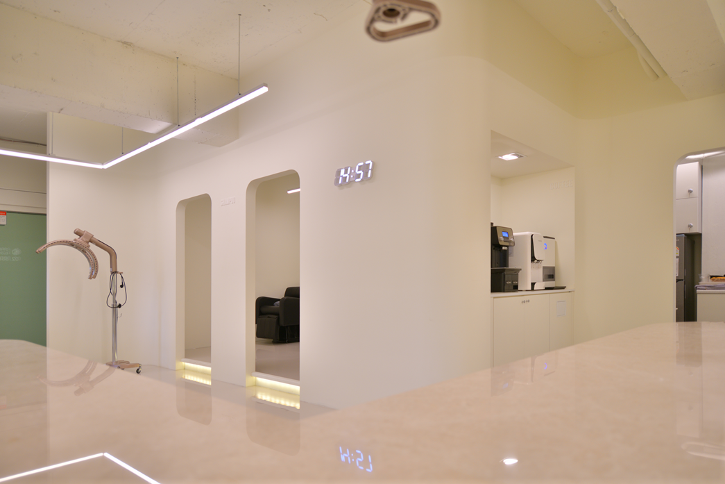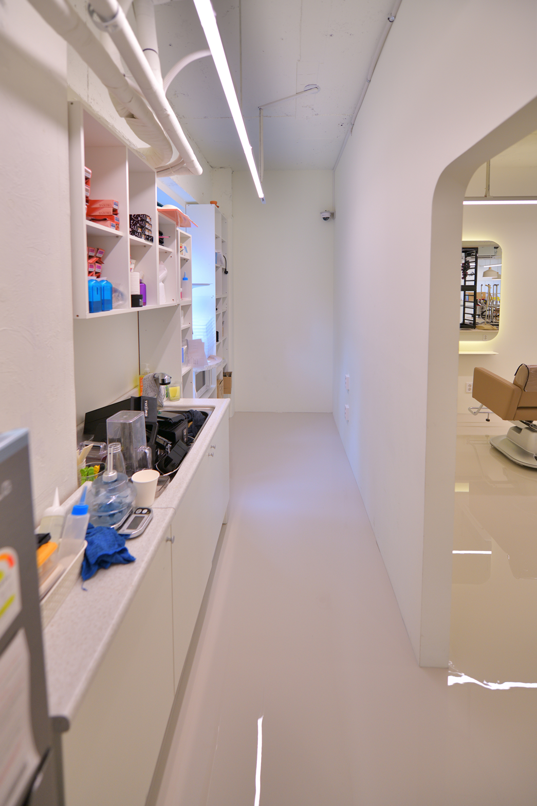 이번 양재미용실인테리어에서는 작은 틈도 허투루 두지 않고 벽면 코너를 활용하여 커피머신과 정수리를 배치하여 편리하면서도 공간 활용이 돋보이도록 하였습니다.