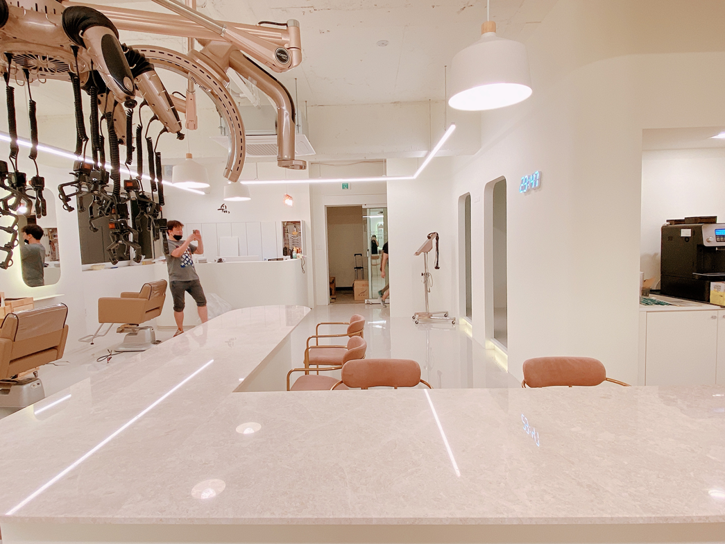 이번 양재미용실인테리어는 고급스러운 디자인 연출을 위해 은은한 광택이 도는 대리석 바닥재를 사용하여 공간을 훨씬 고급스럽게 연출하였습니다. 이 메인홀은 방문 고객이 가장 오래 머무르는 공간이므로, 색감은 최대한 단정하게 잡고 가구와 조명으로 포인트를 주는 방식으로 연출해 시각적으로 정돈된 고급미를 전달합니다.