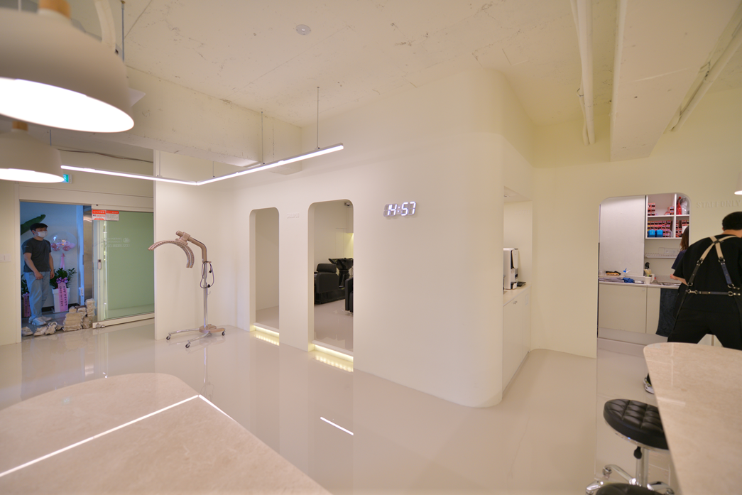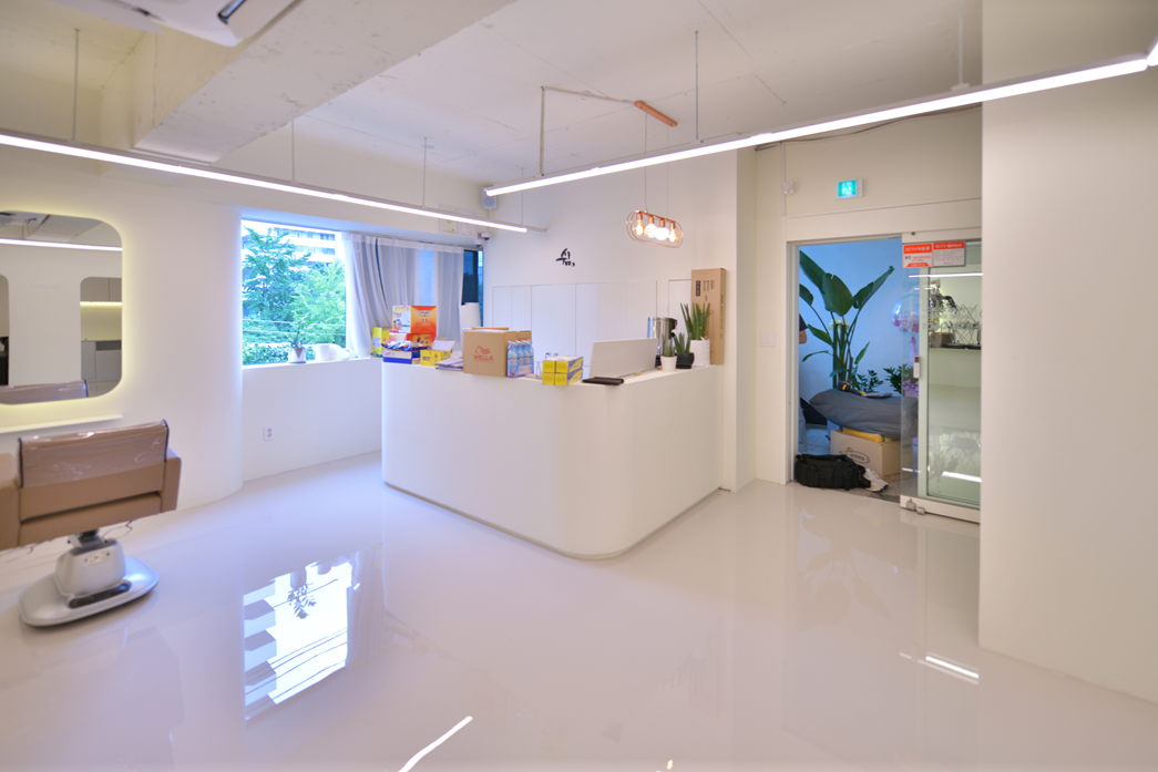 양재미용실인테리어의 전체 공간은 밝은 아이보리 톤의 대리석 바닥과 화이트 벽면으로 구성해 처음 들어왔을 때부터 확 트인 개방감이 느껴지고, 여기에 은은한 조명 설계를 더해 전체 공간이 더욱 넓고 고급스럽게 보이도록 디자인 한 것이 특징입니다.