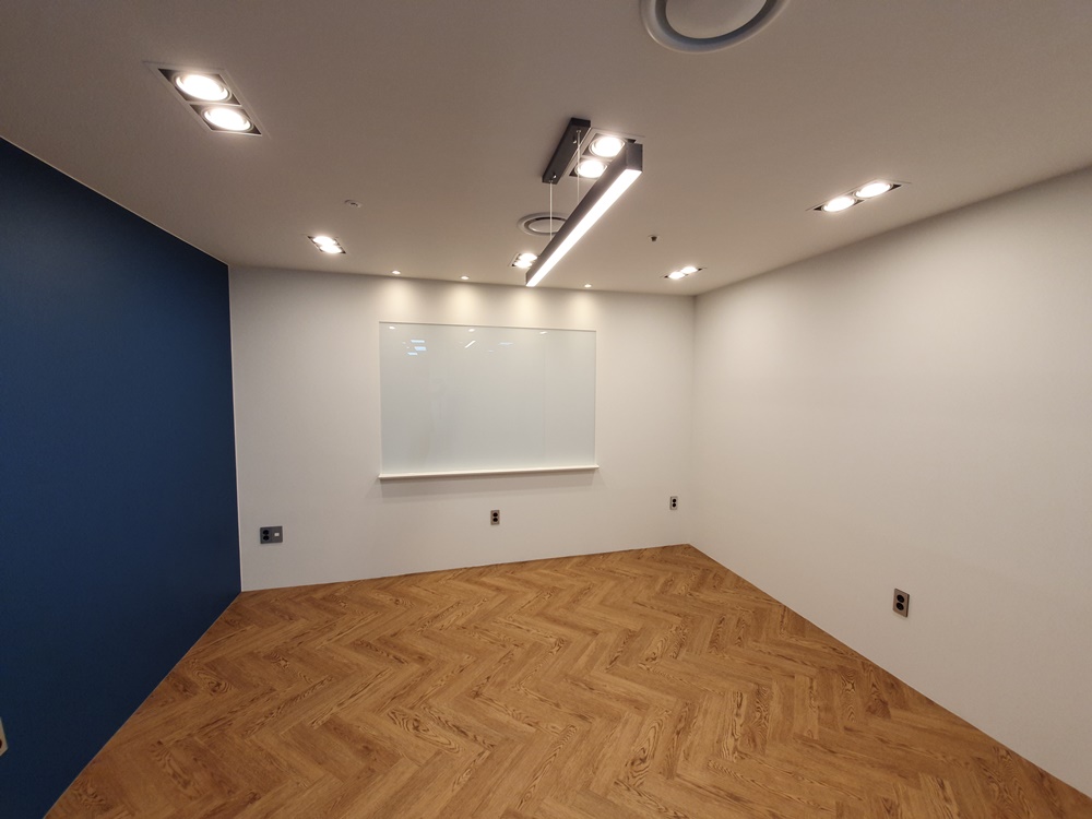 대표실과 회의실 조명은 매입형으로 시공했는데 공용 사무공간과 다른 원형 조명을 적용했고 회의실에는 테이블이 놓일 위치의 천장에 팬던트형 형광등을 달아 조도를 보완했습니다. 회의실 한쪽 벽면에는 화이트 보드를 설치해 이용성과 편리성을 높였고 벽면 하단부를 따라 전기를 이용할 수 있는 콘센트를 시공해 다양한 기기를 편리하게 사용할 수 있도록 배선을 깔끔하게 정리했습니다.