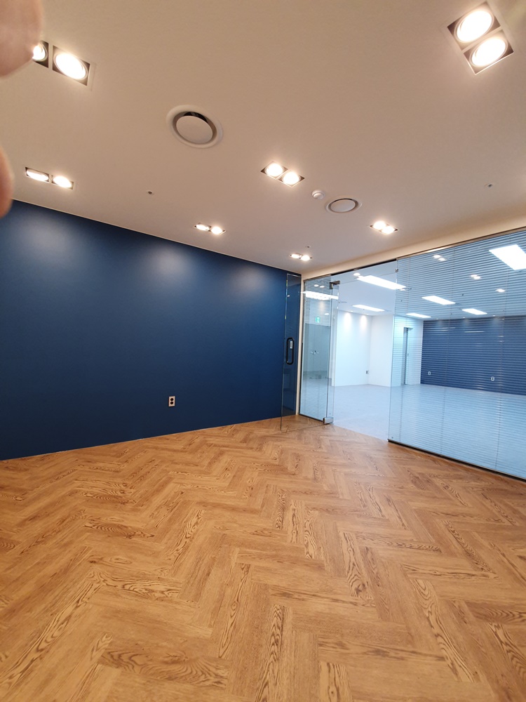 유리 가벽으로 구분되어진 대표실과 회의실입니다. 바닥은 고급스러운 헤링본 패턴의 원목 바닥으로 마감해 영역성을 부여했고 벽면은 화이트를 적용했으며 두 공간을 나누는 가운데 벽은 딥블루 컬러를 적용해 디자인적 통일성을 부여했습니다.
