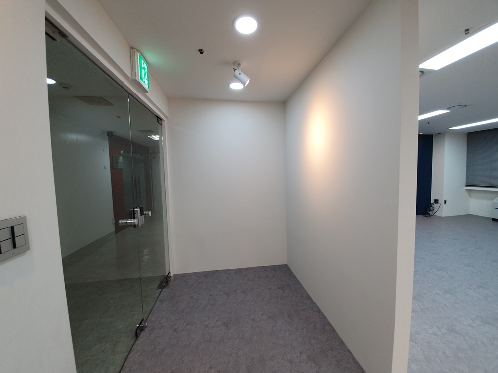 입구 파사드와 내부 파사드입니다. 입구는 화이트와 유리로 시공해 깔끔하게 연출했고 내부 파사드와 인테리어가 외부 익스테리어로 작용할 수 있도록 했습니다. 내부는 벽면을 세우고 외부와 마찬가지로 화이트로 마감한 후 갤러 조명을 설치해 차후 설치될 현판을 강조함으로써 가독성을 높일 수 있도록 했습니다.