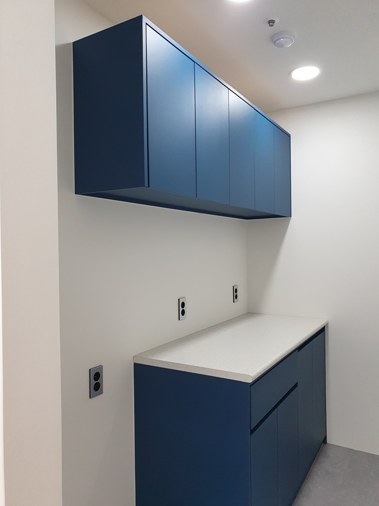 탕비실 공간입니다. 공용 사무공간과 가까운 곳에 구성해 직원들의 동선을 절약했고 가벽으로 공간을 나눠 잠시 쉴 수 있는 공간이 될 수 있도록 했습니다. 상부장과 하부장을 시공하고 콘센트를 설치해 전기주전자, 커피머신, 정수기, 냉장고 등의 다양한 기기를 충분히 사용할 수 있도록 배려했습니다.