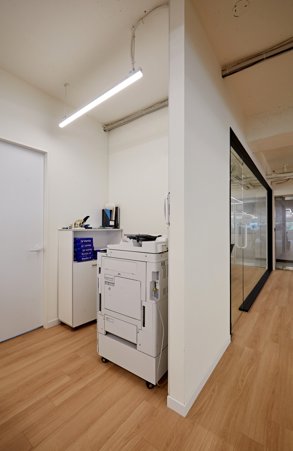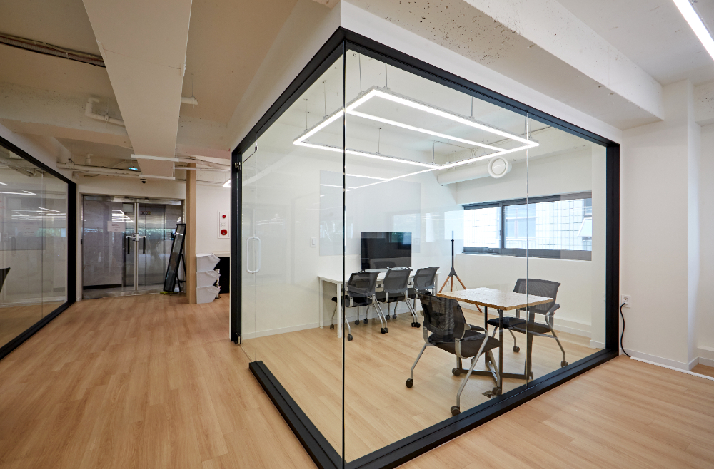 사무공간으로 이어지는 곳들도 마찬가지인데요. 통일감을 주기위해서 전체 벽면은 화이트로, 바닥은 원목 자재를 활용했으며 프레임은 전부 블랙으로 통일했습니다. 그리고 공간 자체가 넓지 않기 때문에 답답함을 줄이기 위해서 도어는 전부 유리로 설치했습니다.