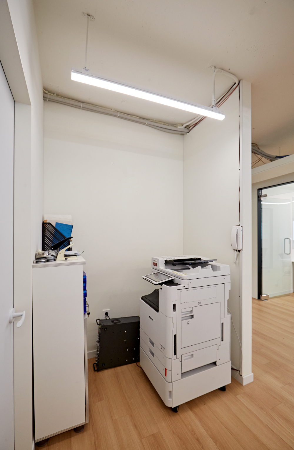 마지막으로 별도의 룸을 만들어두지 않고, 살짝 튀어나온 가벽만으로도 그 속에 프린터기와 간단한 수납함을 숨겨두었는데요. 가벽으로 가려져있기에, 시야는 차단할 수 있어 정리정돈된 모습 연출도 가능합니다.