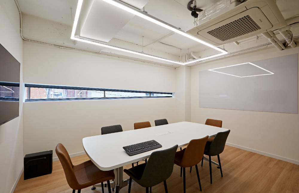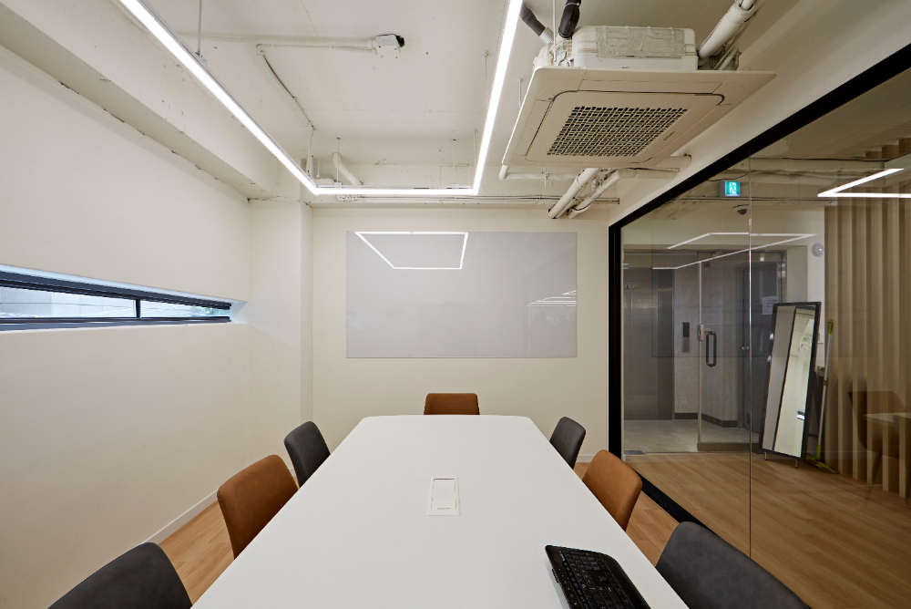 회의실은 블랙프레임의 통창이 돋보이는 공간이며, 내부는 미니멀한 컨셉으로 화이트 인테리어입니다. 특별하다고 할 것이 없어 보이지만, 회의에 집중할 수 있는 환경으로 구성하였고 의자로 포인트를 주었는데요.
