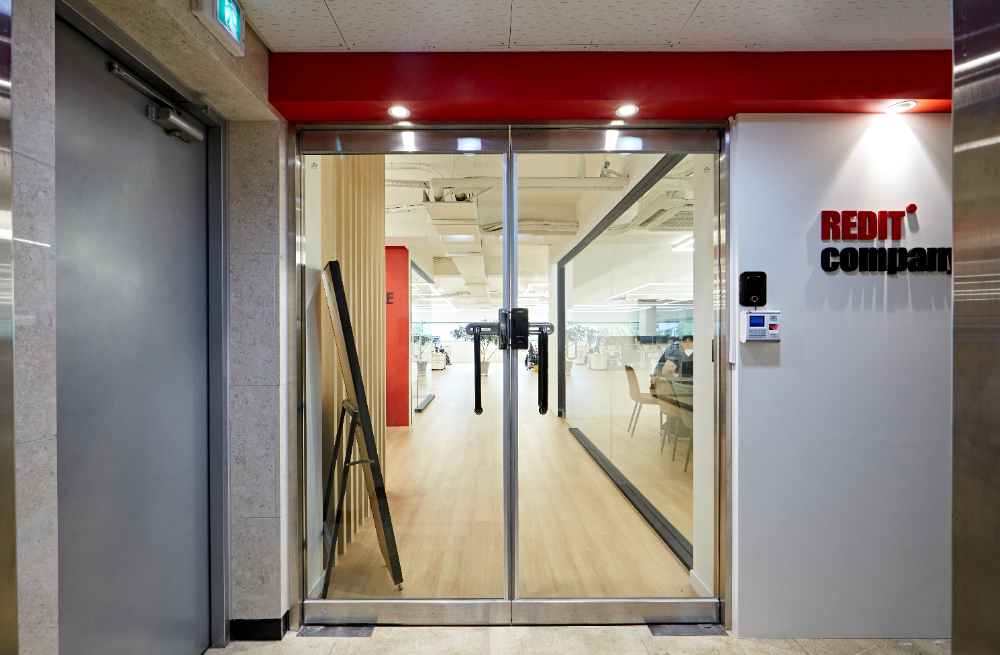 내부로 들어서면 가장 먼저 휴게실이 위치합니다. 대부분 사무실마다 동선에 따라 공간을 배치하는 방식이 다른데요. 고양시 덕양구 향동 GL 메트로시티 사무실인테리어는 입구에서부터 정적인 느낌을 줄이고 생동감있는 사무실 분위기를 만들기 위해서 휴게공간을 가장 앞으로 배치하였습니다. 강렬한 레드컬러의 아트월이 돋보이고, 바테이블과 1인용 쇼파등을 개성있게 위치하였습니다.