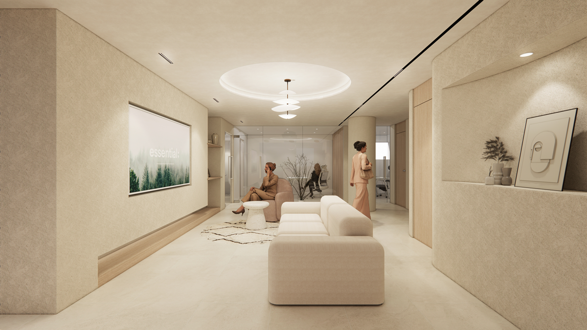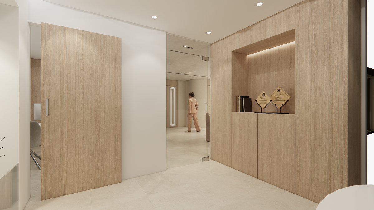 디자인 컨셉: 신뢰감을 줄 수 있는 아이보리, 베이지 컬러를 메인으로 사용하고, 우드 소재를 포인트로 활용하여 편안하면서도 세련된 분위기를 연출하였습니다.