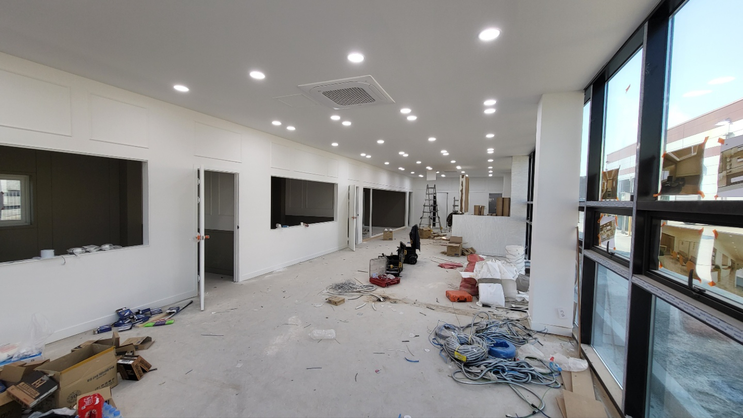 최종 시안 확정 후 현장 공사를 진행 했습니다. 고양 덕양구 사무실인테리어의 경우 새로 시공한 컨테이너형이었기 때문에 철거 없이 기초 설비 작업부터 시작했습니다. 전기와 수도, 소화전, 스프링큘러까지 디자인 설계에 맞춰 설치하고 각각의 공간으로 구분 했는데요.