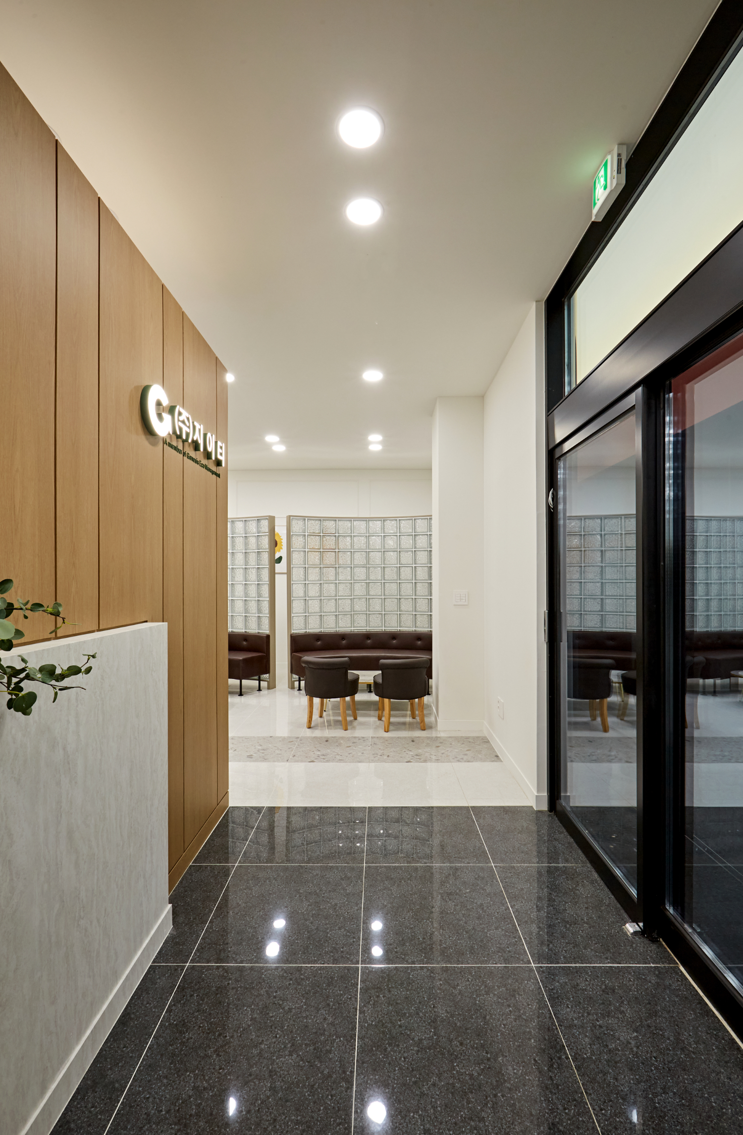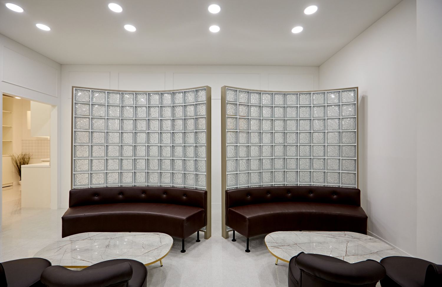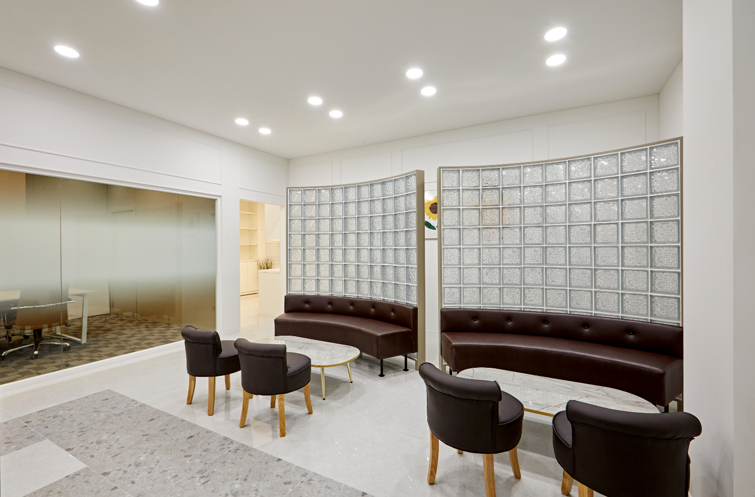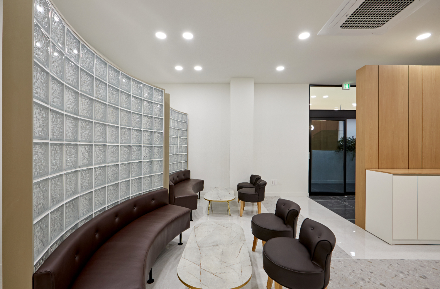 복도를 기준으로 우측은 휴게 공간으로 구성 했습니다. 기능성이 뛰어난 유리블록을 가벽으로 사용해 포인트를 주었습니다. 가벽의 라운드 형태에 맞춰 가구도 라운드로 배치했고 브라운 컬러로 안정감이 느껴지는 공간입니다.