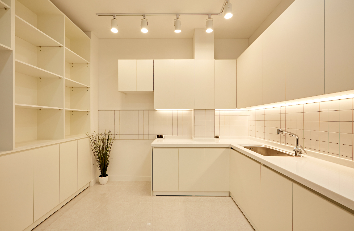 유리블록 가벽 뒷편을 따라 들어가면 탕비실이 위치해 있습니다. 개방감을 위해 도어라인만 만들어 오픈형 공간으로 구성 했는데요. 천장 라인 조명과 상부장 하단에 간접등을 넣어 아늑한 공간이 되었고 앞뒤로 넉넉한 수납 공간을 자랑합니다.