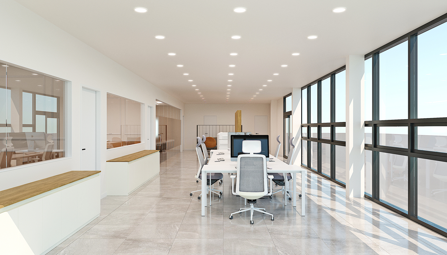 업무 공간은 심플한 디자인으로 제안드렸습니다. 화이트 인테리어에 측면의 큰 창을 그대로 살려 개방감 있는 모습입니다.