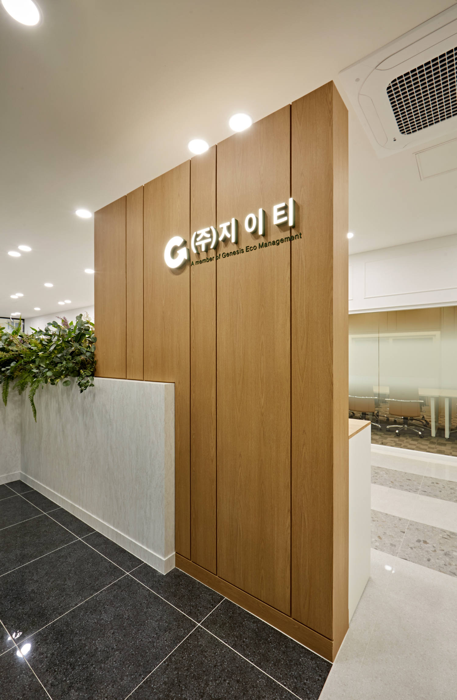 내부로 들어오면 우드 아트월이 제일 눈에 띄는데요. 아트월의 우드 패턴은 새로로 하고 상단에 심플하게 기업 로고를 사인물로 부착했습니다. 아트월 측면으로는 ㄱ자 형태의 오브젝트와 플렌테리어로 디자인 포인트를 주었습니다.