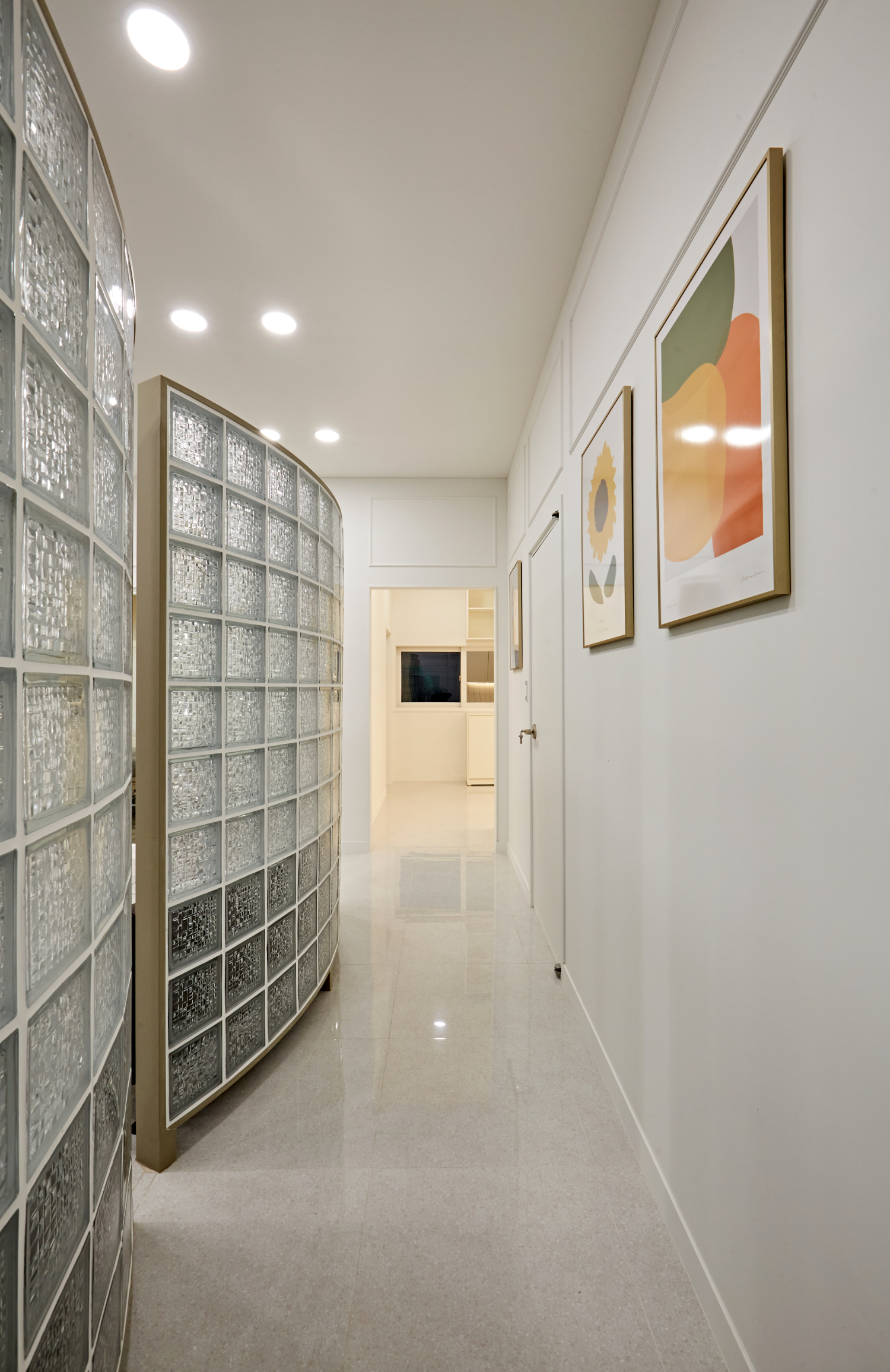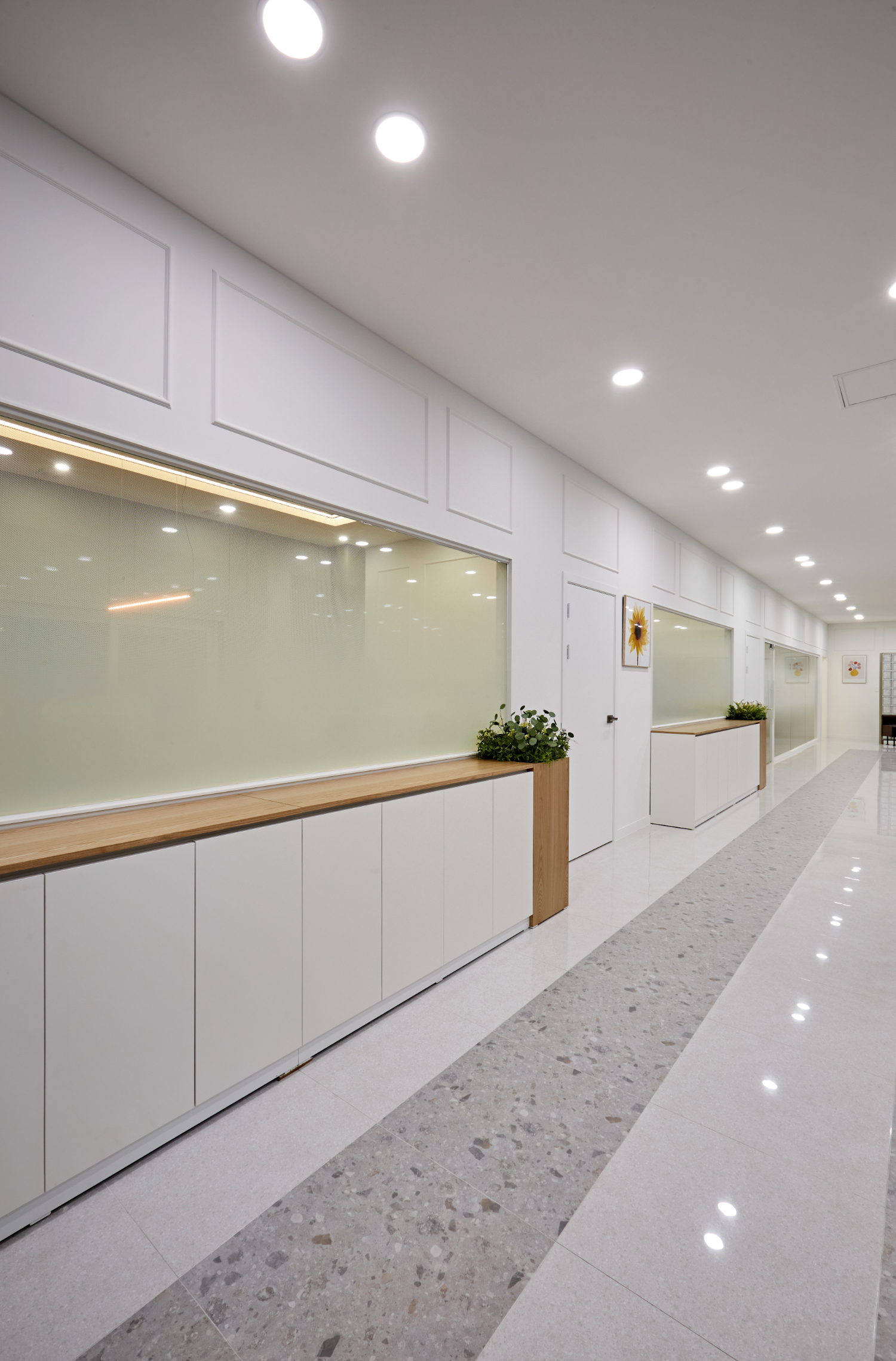 가로가 긴 구조로 복도형으로 공간을 구분 했고 복도의 바닥은 유광 타일과 그레이 테라조 타입을 같이 사용하여 고급스러운 분위기를 연출 했습니다.