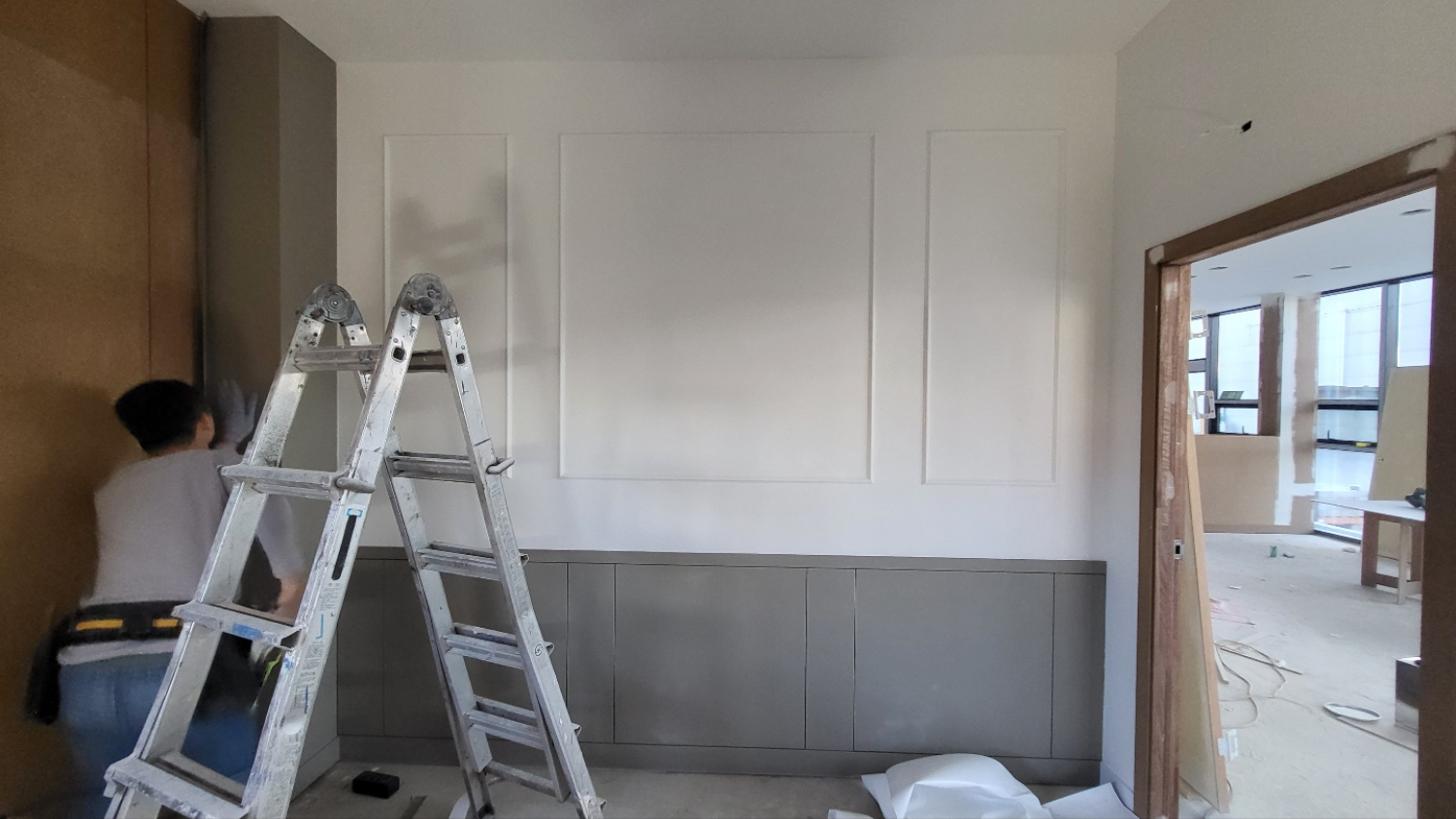 내벽은 목공 작업을 베이스로 진행하여 아트월, 가벽, 도어라인, 선반 등 다양하게 적용했습니다. 텅 비어있던 공간이 점점 틀이 잡혀가며 새로운 공간으로 만들어지고 있습니다. 916디자인의 현장팀은 오랜 경력의 시공 전문가들이 하나의 팀으로 구성되어 계속해서 손발을 맞춰오고 있는만큼 완성도 높고 안정적인 시공이 가능합니다.