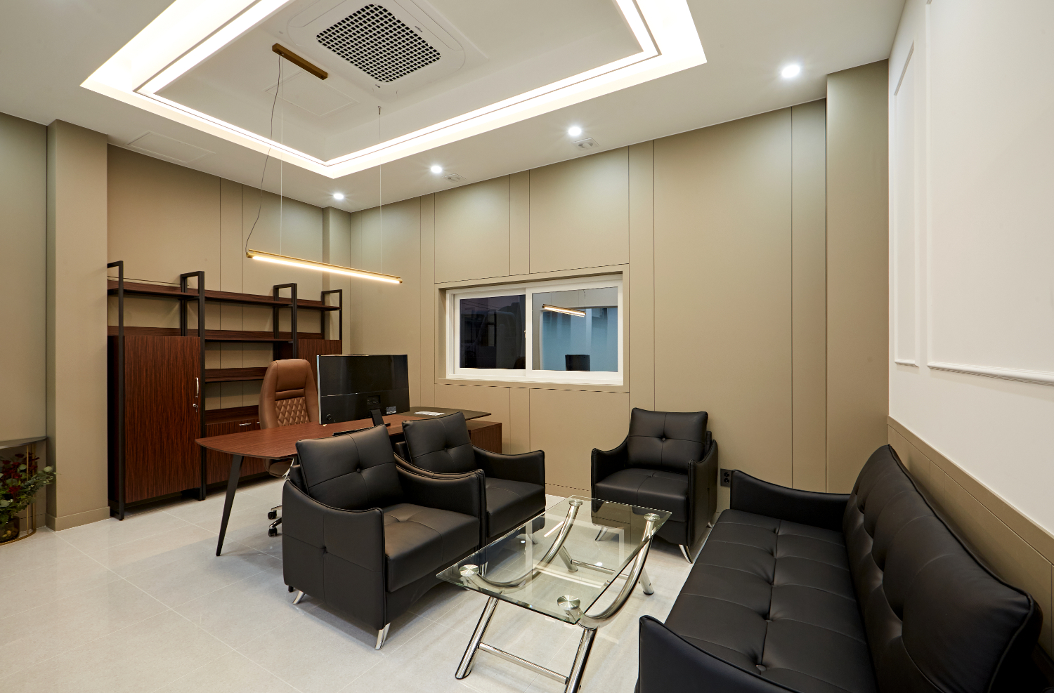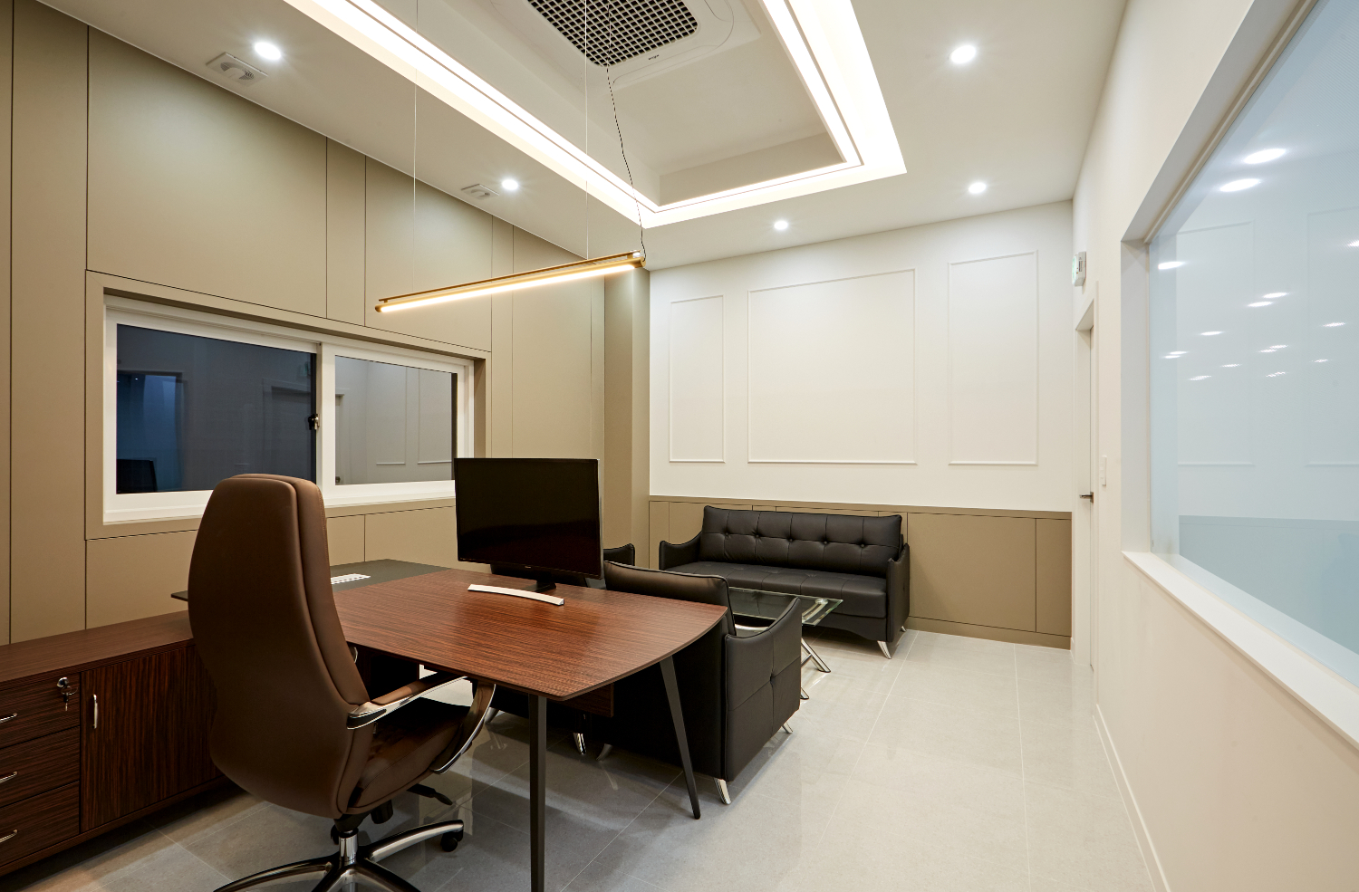 마지막으로 살펴볼 공간은 대표실입니다. 대표실은 회의실과 마찬가지로 베이지 컬러를 주로 사용하여서 고급스러우면서도 차분한 이미지를 주었습니다. 집중할 수 있는 환경을 만드는데에 주력하였는데요. 천장의 우물형 타입과 벽면 웨인스코팅으로 고급스러움이 느껴지는 공간입니다.
