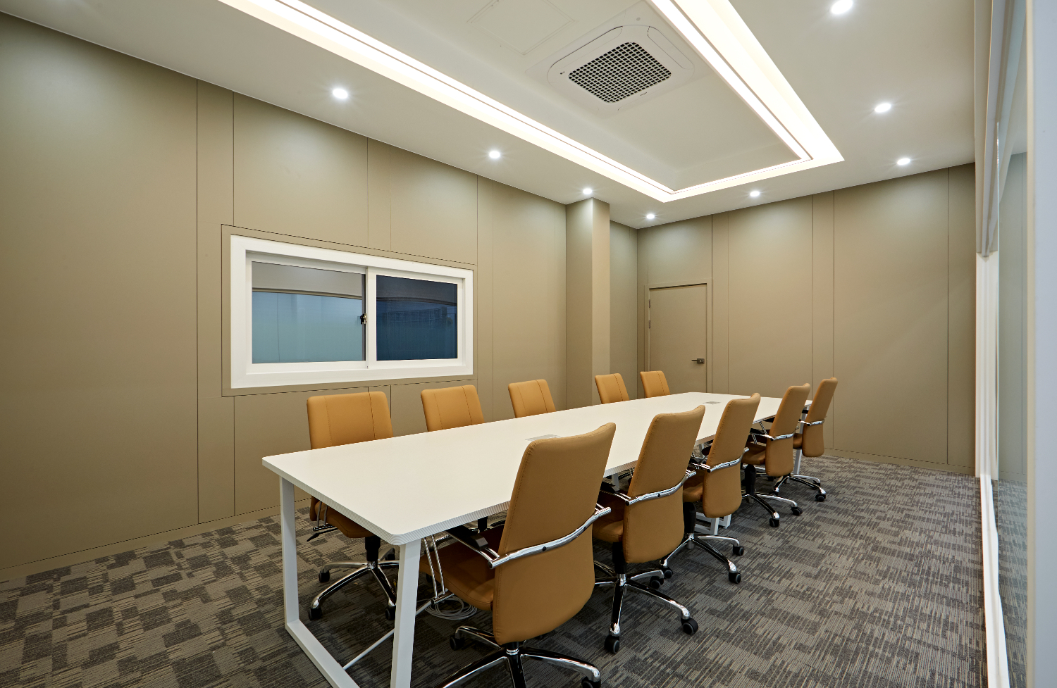 오피스나 다른 공간과 달리 회의실과 대표실은 베이지 컬러를 베이스로 사용하여 차분한 분위기를 연출 했습니다. 회의실 바닥은 카펫 타일로 마감하여 무게감 있는 모습이며, 화이트보드를 설치하여 공간 활용도를 높여주었습니다.