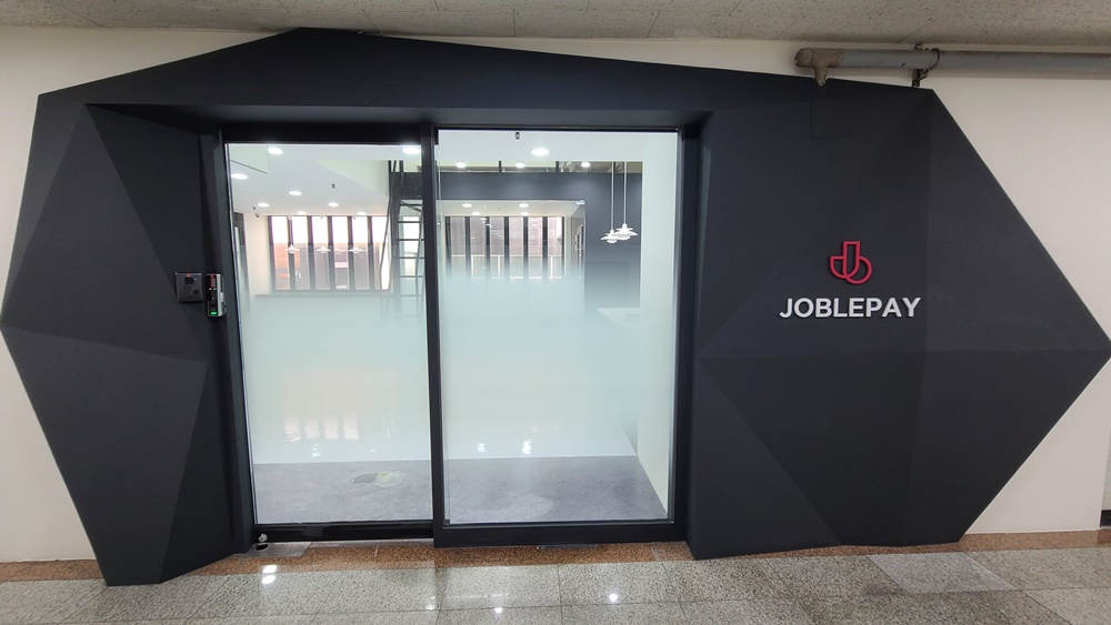 완성된 입구 파사드입니다. 입체적으로 시공된 파사드에서 자유롭고 크리에이티브한 이미지가 느껴지시나요? 블랙 프레임에 대비되는 화이트로 회사명을 시공해 간결하면서 세련된 파사드가 완성됐습니다.