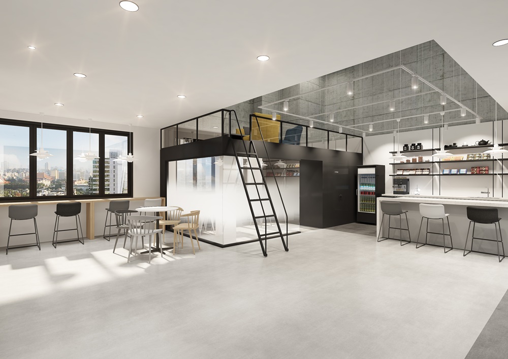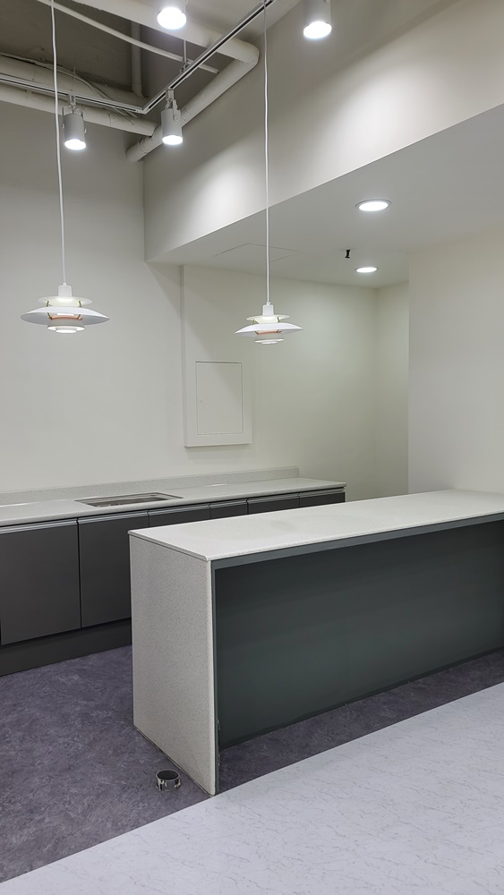 복층 옆 공간은 탕비실 공간으로 화이트블랙으로 대비된 가구와 조명으로 깔끔하게 꾸몄습니다.