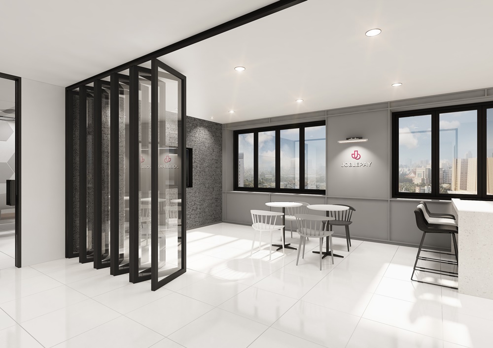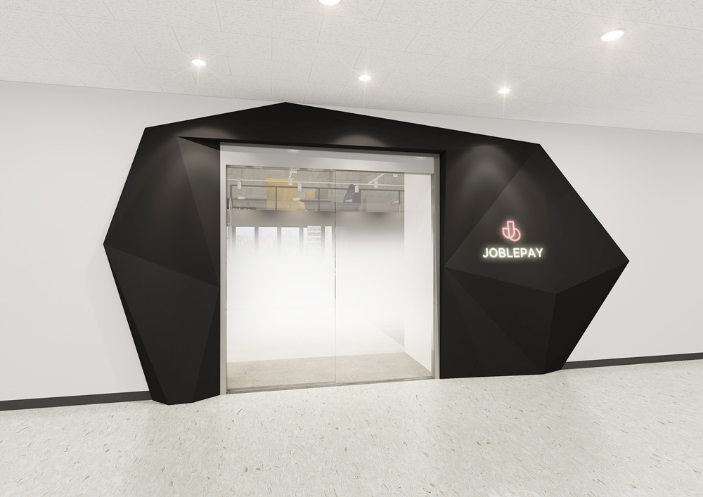 입구 파사드 역시 화이트블랙 스타일로 디자인해 자유로운 분위기의 회사 이미지를 비정형 다각형을 입체적으로 디자인하고 안개 시트지가 적용된 유리 도어로 감각적으로 연출했습니다. 내부는 화이트와 블랙으로 대비했지만 따뜻한 우드톤과 밝은 컬러를 함께 사용해 캐주얼한 분위기를 연출하고 있습니다.