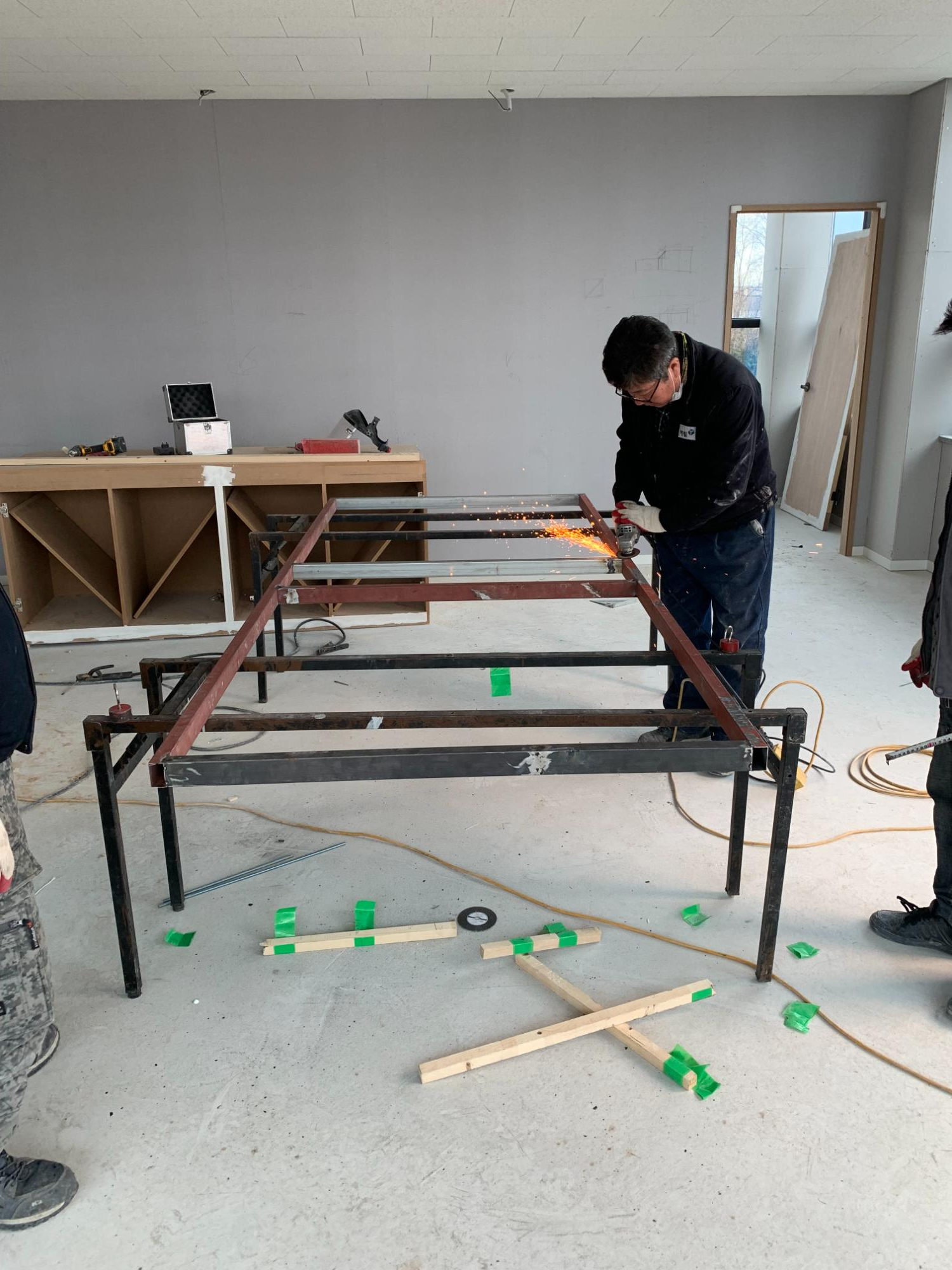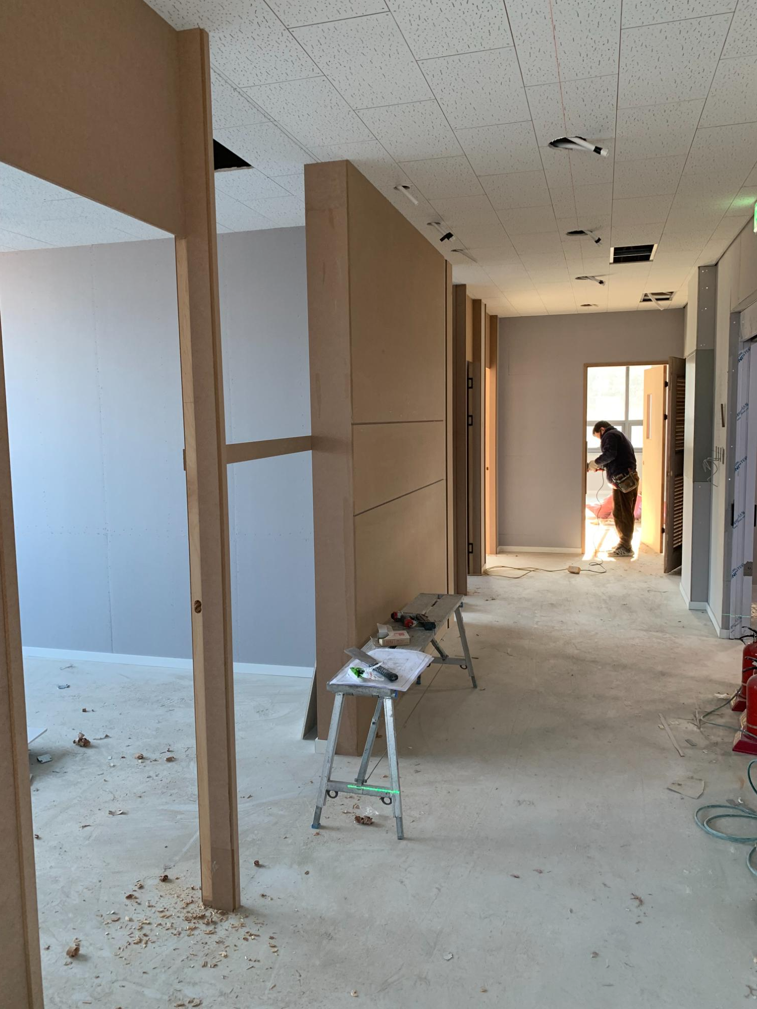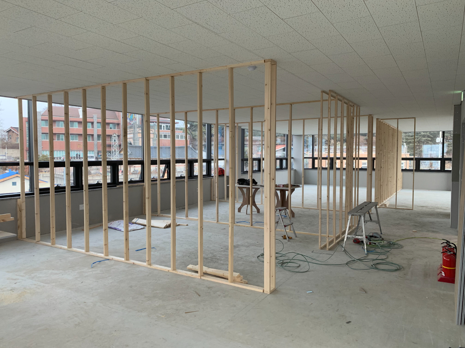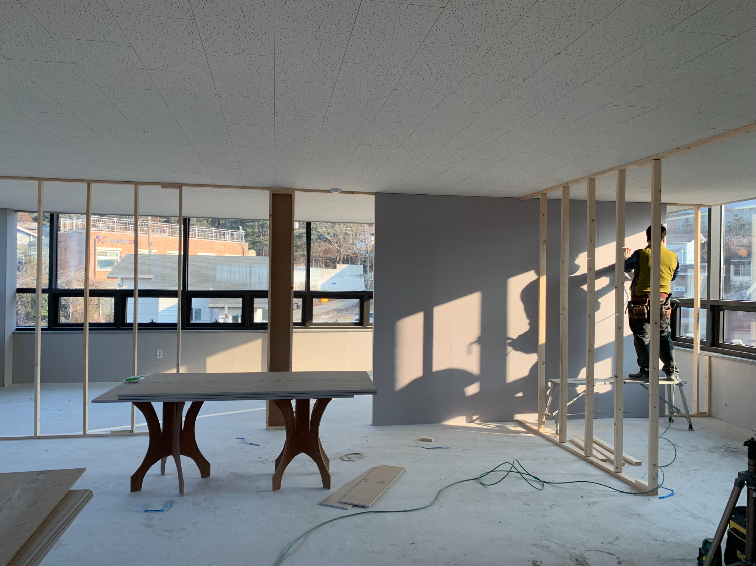 우선 가장 중요한 것 중 하나는 넓게 트여있는 건물에서 각 공간의 크기를 배치하고 효율적인 동선을 고려하여 분리하는 것이었습니다. 베타랑 기사들이 힘을 합쳐서 정확한 계산을 통해 목공 작업으로 가벽을 세우기 시작하였는데요.