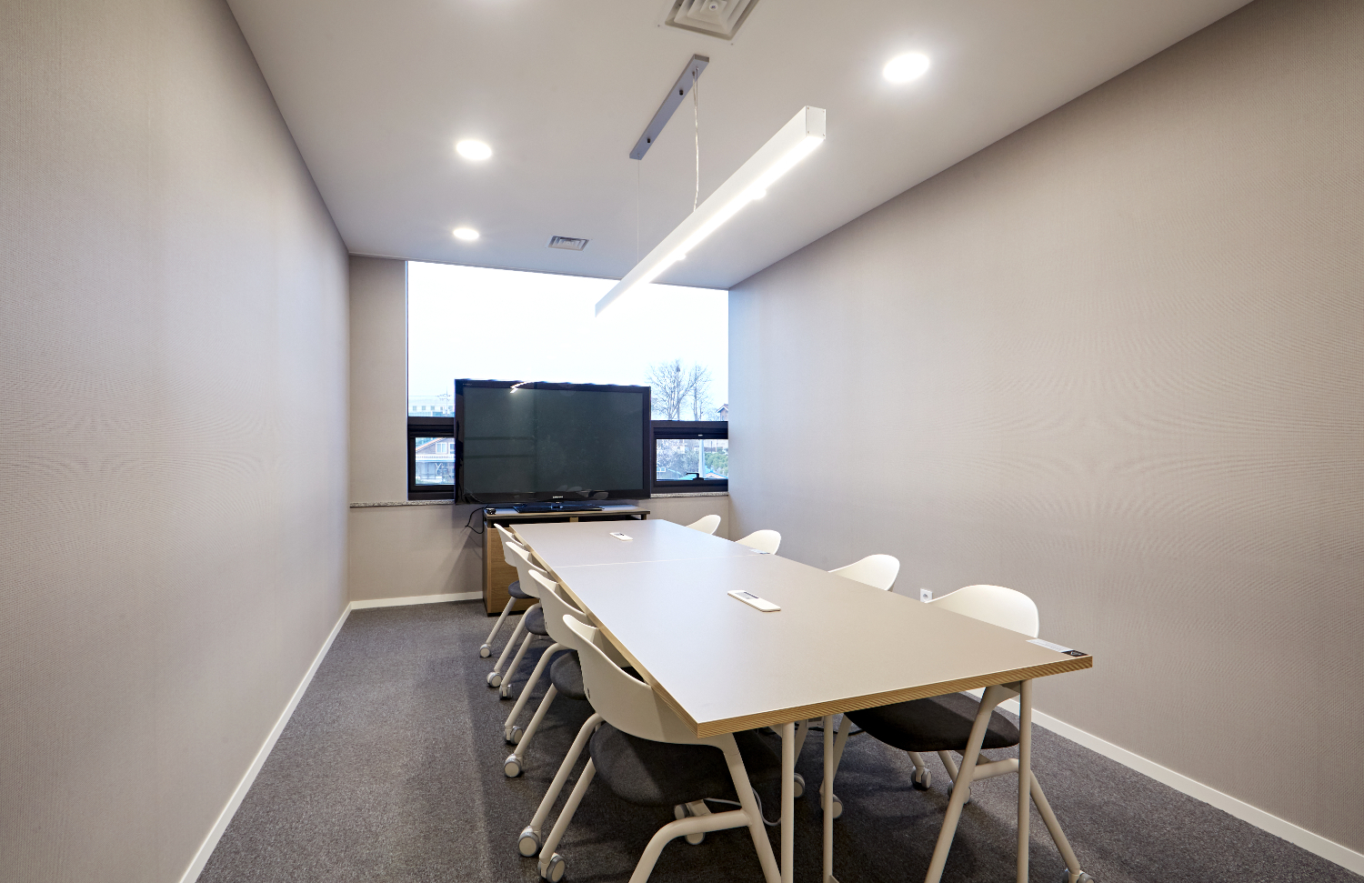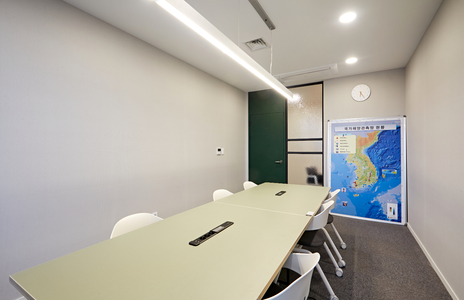 작게 마련된 미팅룸은 팬던트 라인 조명을 시공하였습니다. 마찬가지로 바닥은 그레이 카펫으로 하여서 용도가 비슷한 공간마다는 비슷한 인테리어로 통일감을 주었는데요. 이 또한 고양 사옥인테리어가 하나로 느껴지게 만드는 비결이기도 합니다.