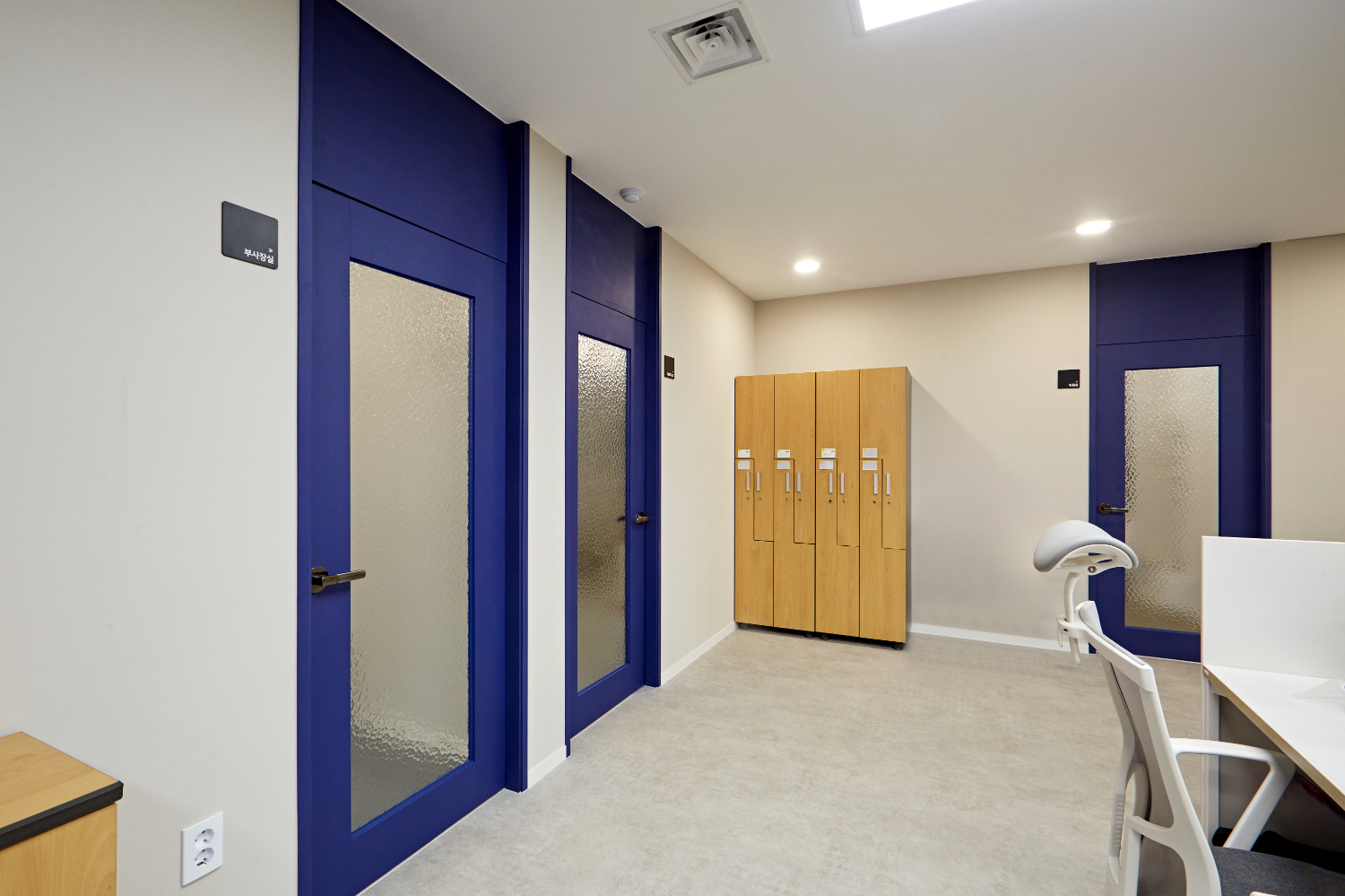 다른 층으로 이어지거나 목적이 바뀔 때에는 벽의 색깔도 다르게 변화를 주었습니다. 쨍한 블루 컬러는 마음을 차분하게 해주고 젊은 생동감을 느끼게 해주는 것은 물론 창의력을 높여주는데에도 도움이 되는데요.