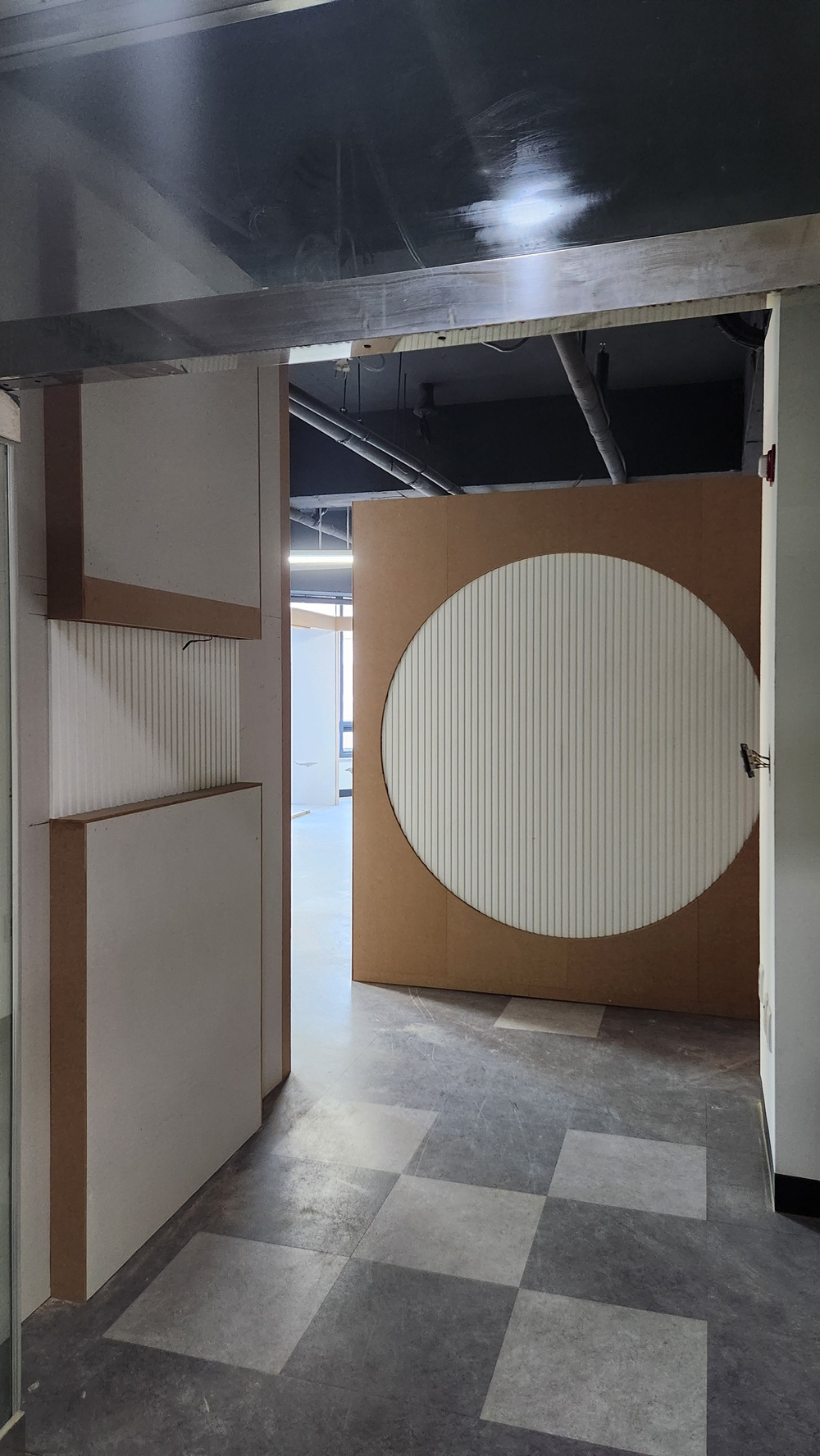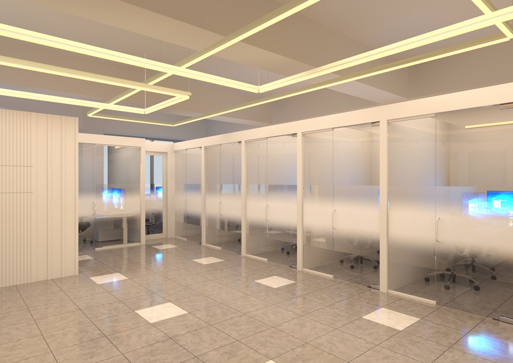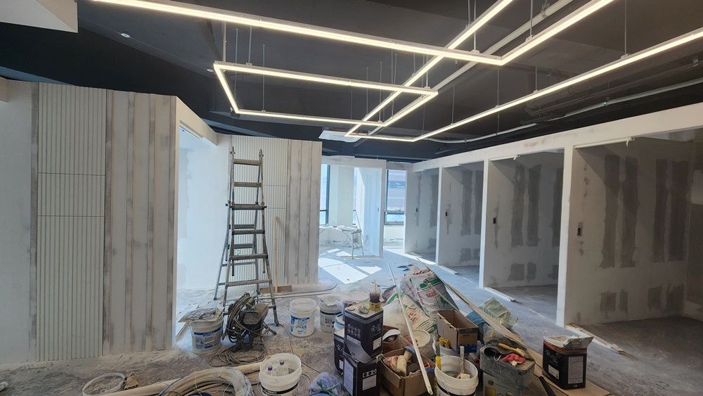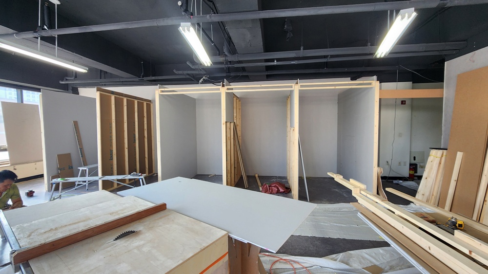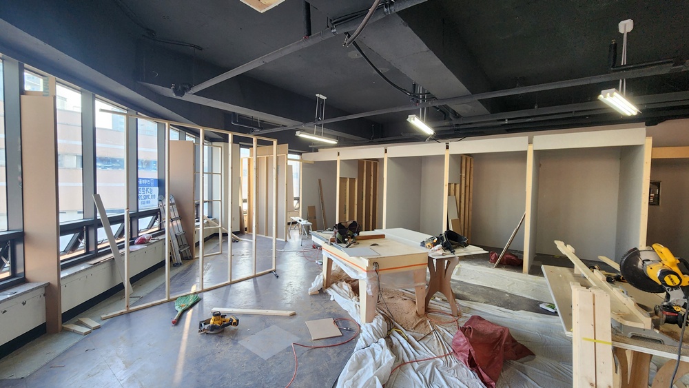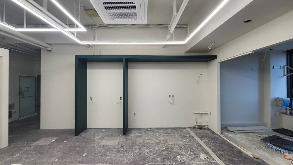 필요에 따라 칸막이 작업이 이루어져 공간을 나누기도 하고, 필요한 경우 천장에 조명 시스템을 설치하는 작업도 포함됩니다.