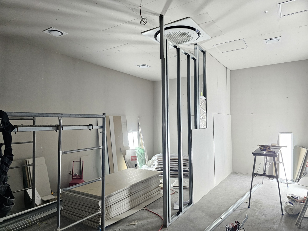 바닥 공사와 벽체 설치가 진행되었으며, 특히 교육장과 로비의 바닥은