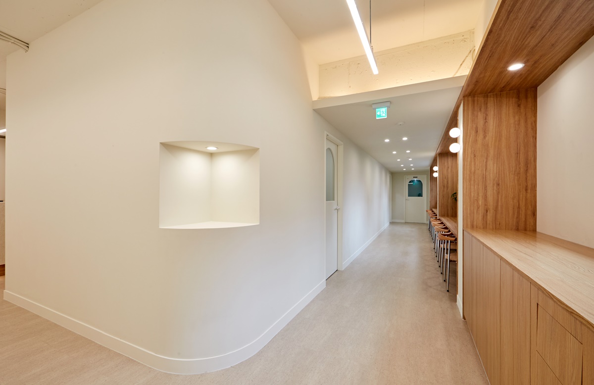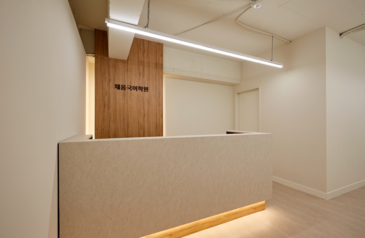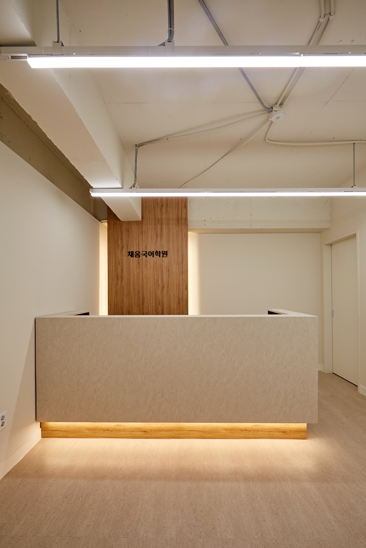 국어 학원이라는 특성상 차분하고 집중할 수 있는 분위기 조성이 중요한데, 우드톤의 벽과 바닥, 가구 등을 활용하면