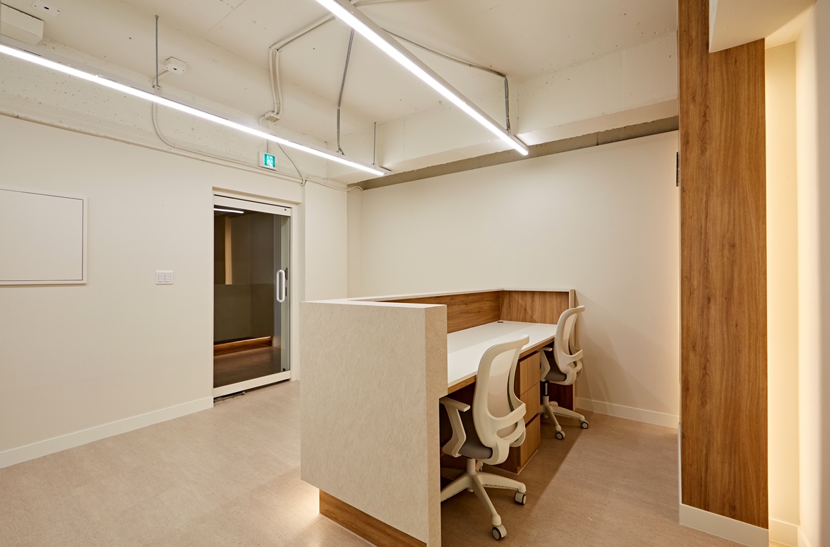 우드 소재의 가구 역시 적절하게 배치되었는데, 책상과 의자는 물론, 책장, 선반, 파티션 등에도 우드 소재를 적용하여