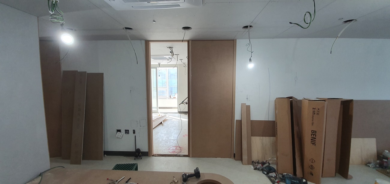 사무실 입구부터 목공 작업을 진행했습니다.