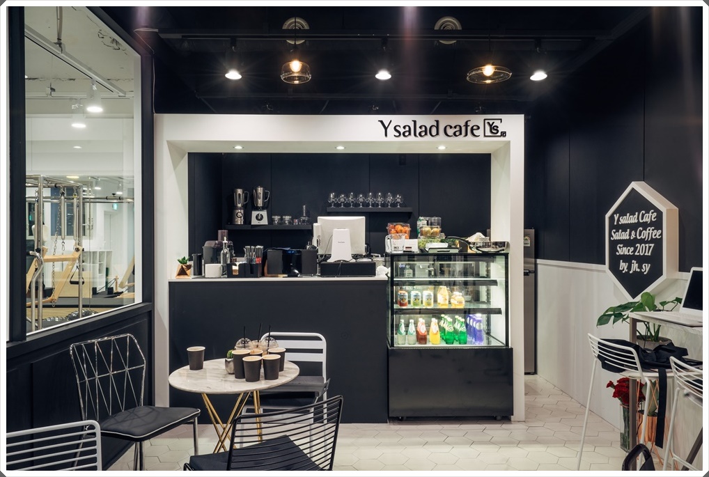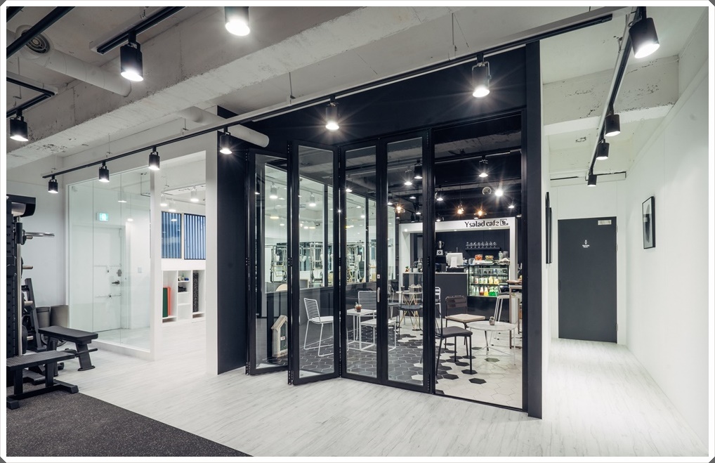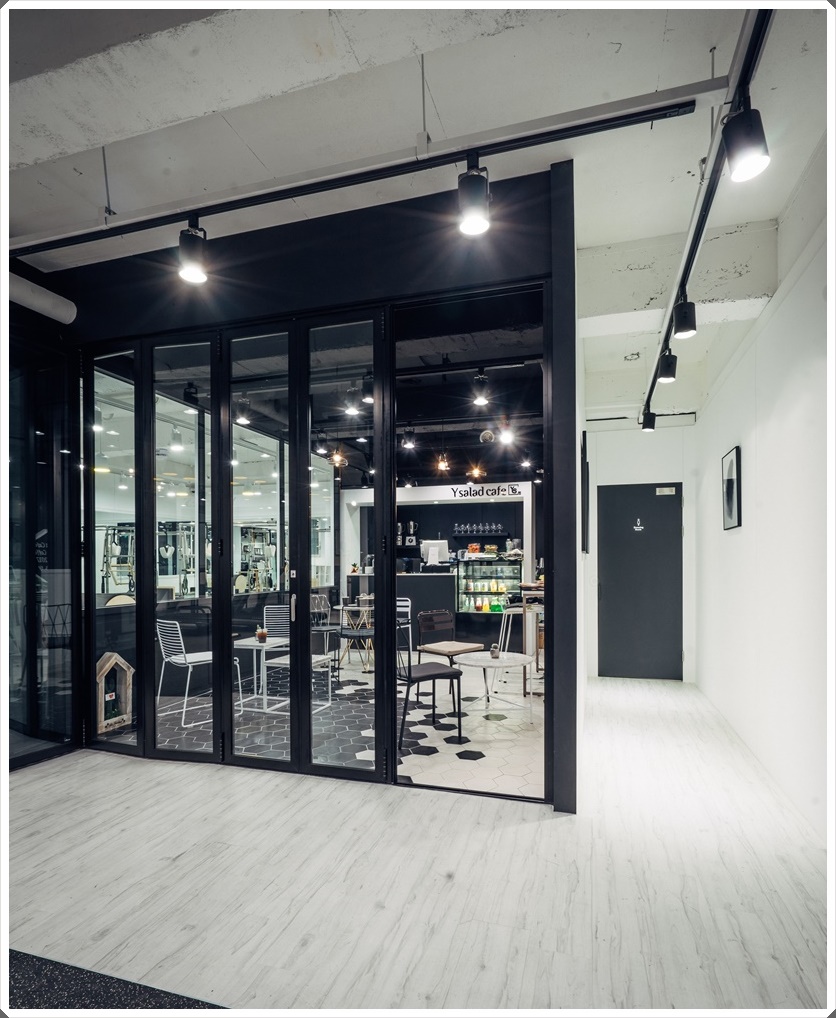 전체적으로 블랙 & 화이트로 인테리어한 카페테리아입니다. 운동을 하는 공간에 카페테리아가 있는 것이 의아할 수 있지만 관리를 하는 회원들을 위해 간단한 샐러드와 건강 음료를 판매하는 곳으로 운동과 식단관리를 함께 할 수 있다는 장점이 있습니다. 천장 레일조명, 블랙 마감 등으로 통일성을 이뤘고 바닥 패턴 타일 시공으로 영역성을 부여했으며 철체 테이블세트로 모던한 분위기를 연출했습니다.