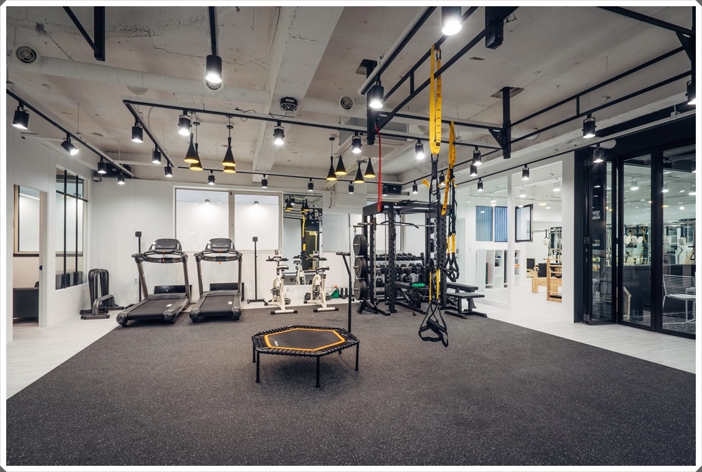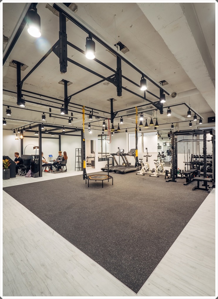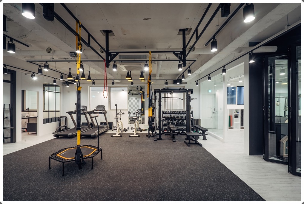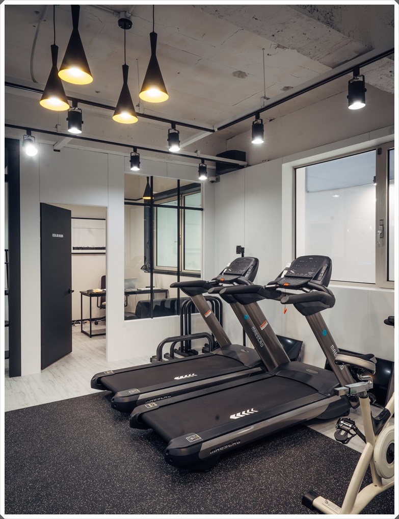 천장을 오픈한 노출천장으로 시공해 층고를 확보했고 화이트로 마감해 깔끔하고 더욱 넓어보이도록 했으며 천장 레일 조명을 시공했습니다. 레일 조명은 위치와 각도 조절을 자유롭게 할 수 있고 스팟 조명으로도 활용할 수 있어 때에 따라 운동에 집중할 수 있는 조도로도 맞출 수 있습니다. 바닥에는 충격과 소음을 흡수하는 바닥 매트를 시공해 부상과 층간 소음을 밪이하도록 했고 매트, 머신, 조명, 프레임 컬러는 블랙을 적용해 디자인 통일성을 부여했습니다.