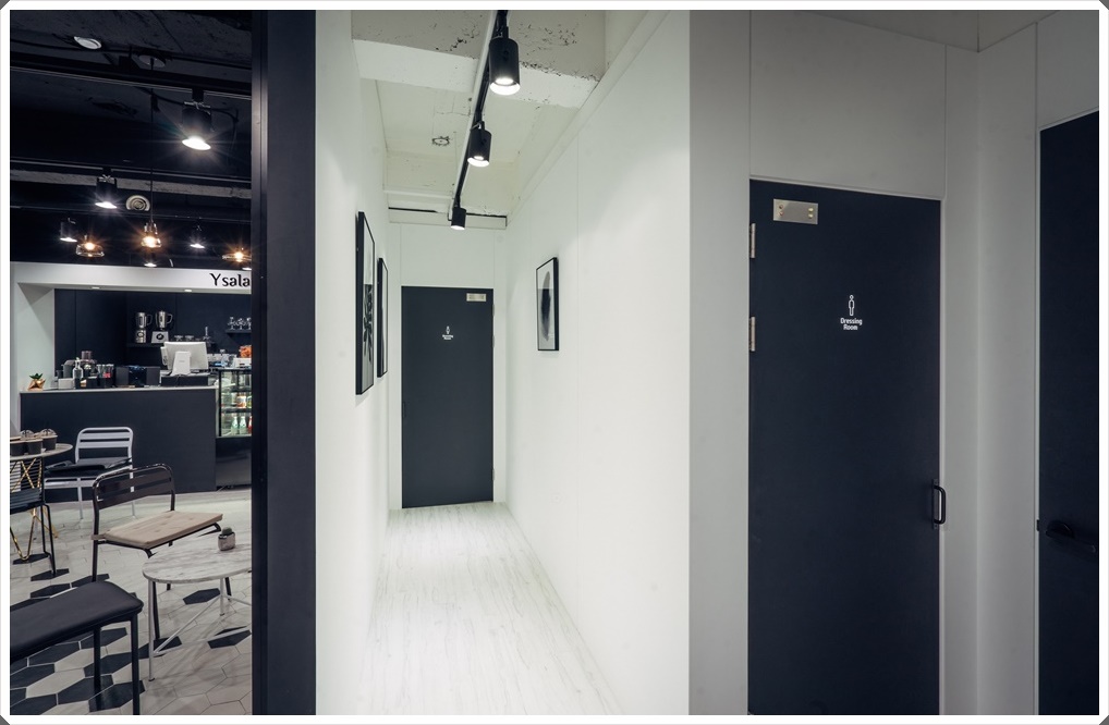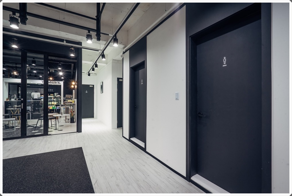 물을 쓰는 공간인 화장실과 탈의실 및 샤워실은 한 쪽 라인으로 몰아 효율적인 시공과 실용적인 사용이 가능하도록 했습니다. 물론, 남녀 화장실을 분리해 안심하고 사용할 수 있도록 했으며 도어는 블랙으로 마감해 전체 인테리어와 어울리도록 했답니다.