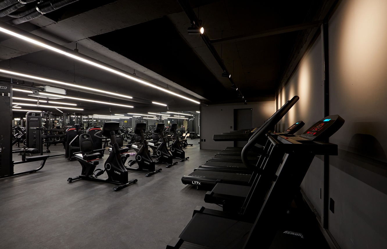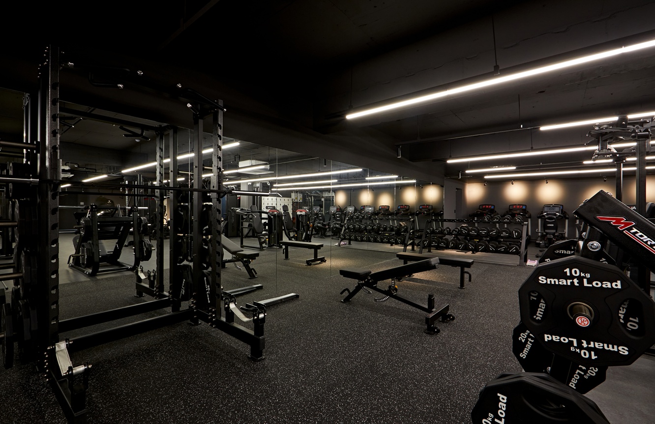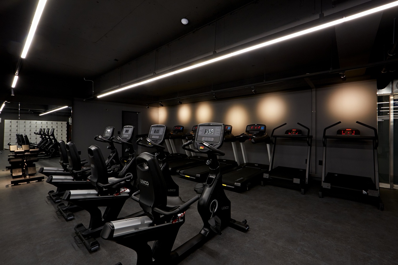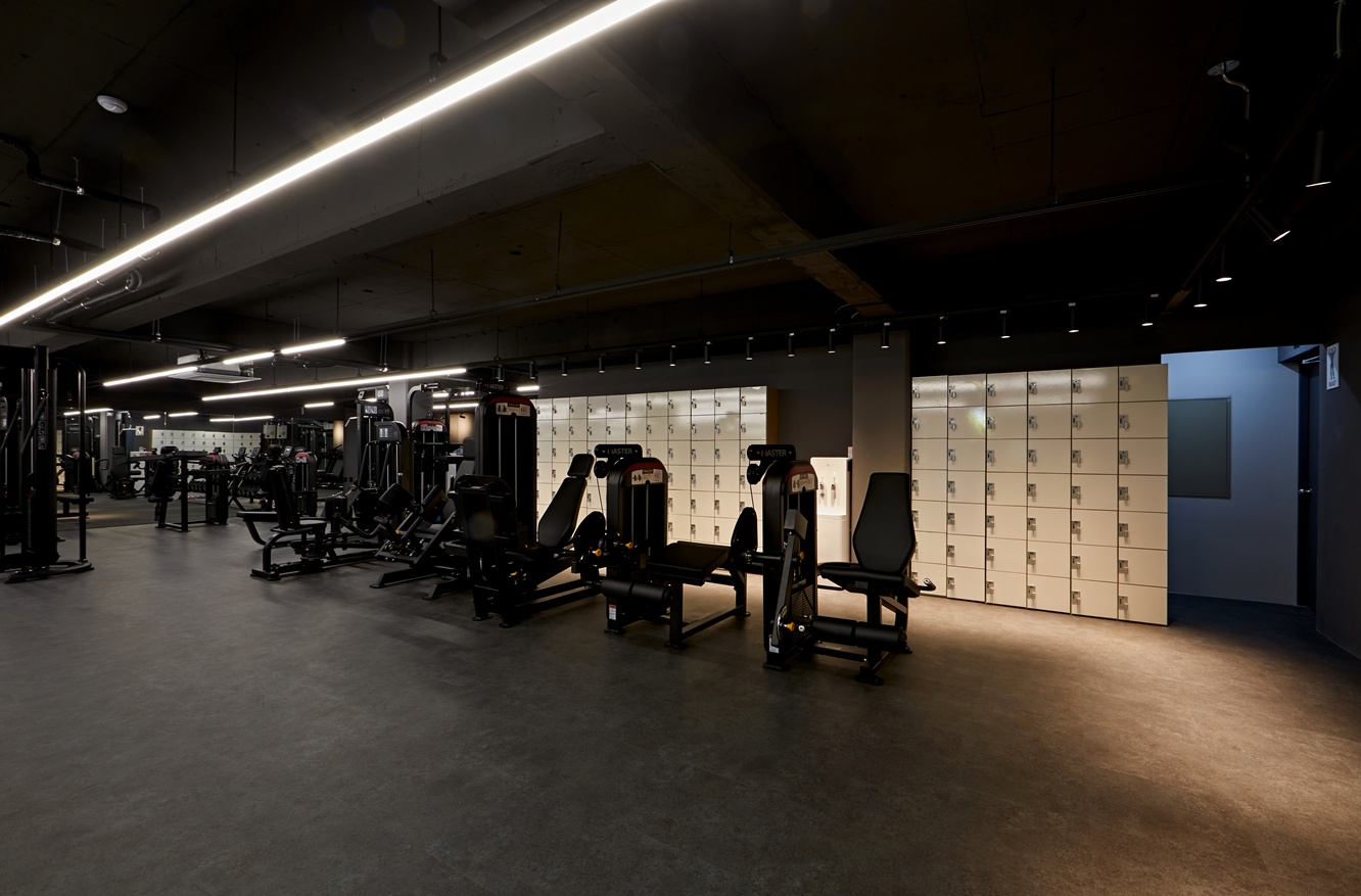 운동 공간은 단순히 운동만을 위한 장소가 아니라, 프리미엄 헬스장으로서의 이미지와 감각을 경험할 수 있는 공간으로 디자인되었습니다. 블랙 톤과 조명의 조합은 세련된 이미지를 유지하면서도 방문객이 편안하게 운동할 수 있는 분위기를 제공한답니다.