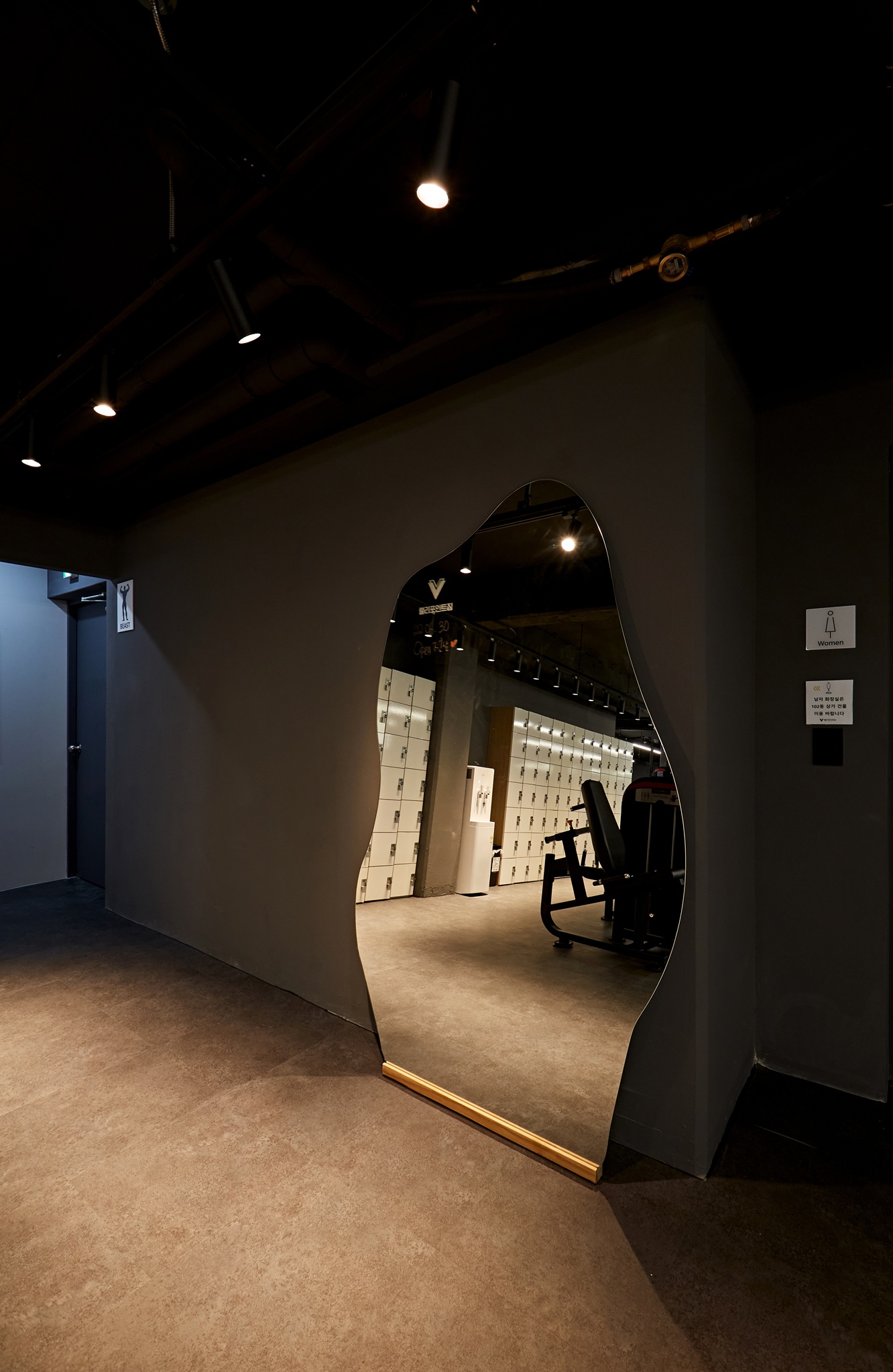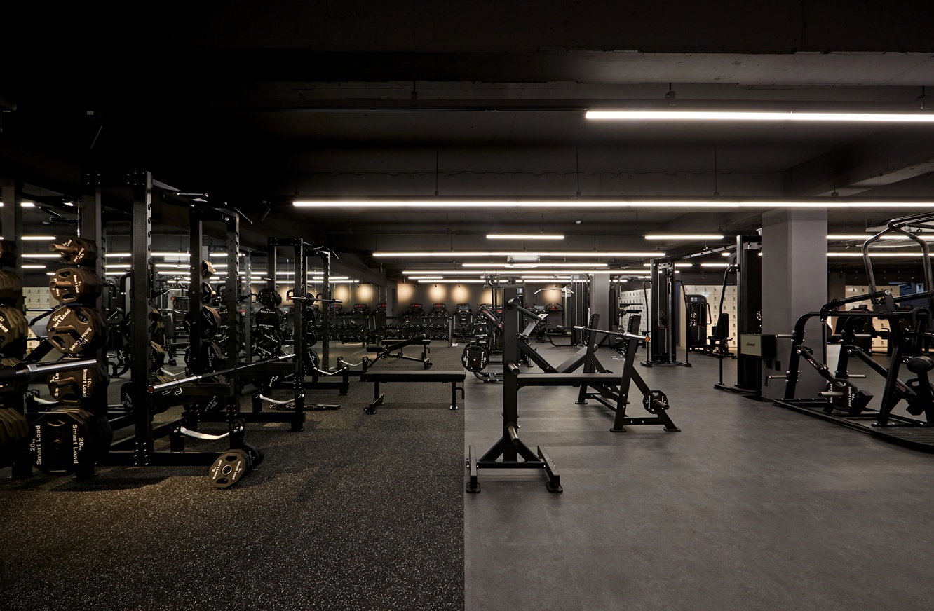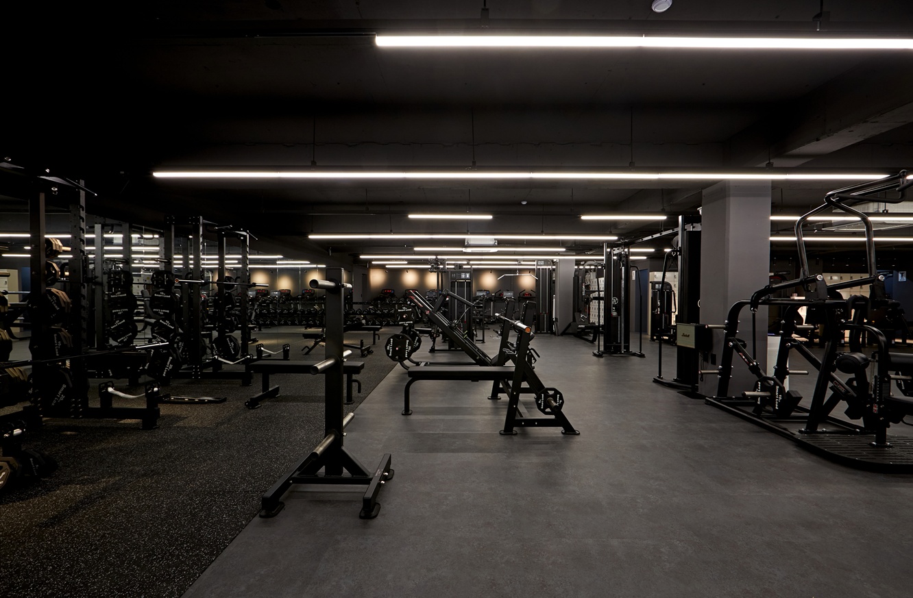 운동 공간은 단순히 운동만을 위한 장소가 아니라, 프리미엄 헬스장으로서의 이미지와 감각을 경험할 수 있는 공간으로 디자인되었습니다. 블랙 톤과 조명의 조합은 세련된 이미지를 유지하면서도 방문객이 편안하게 운동할 수 있는 분위기를 제공한답니다.